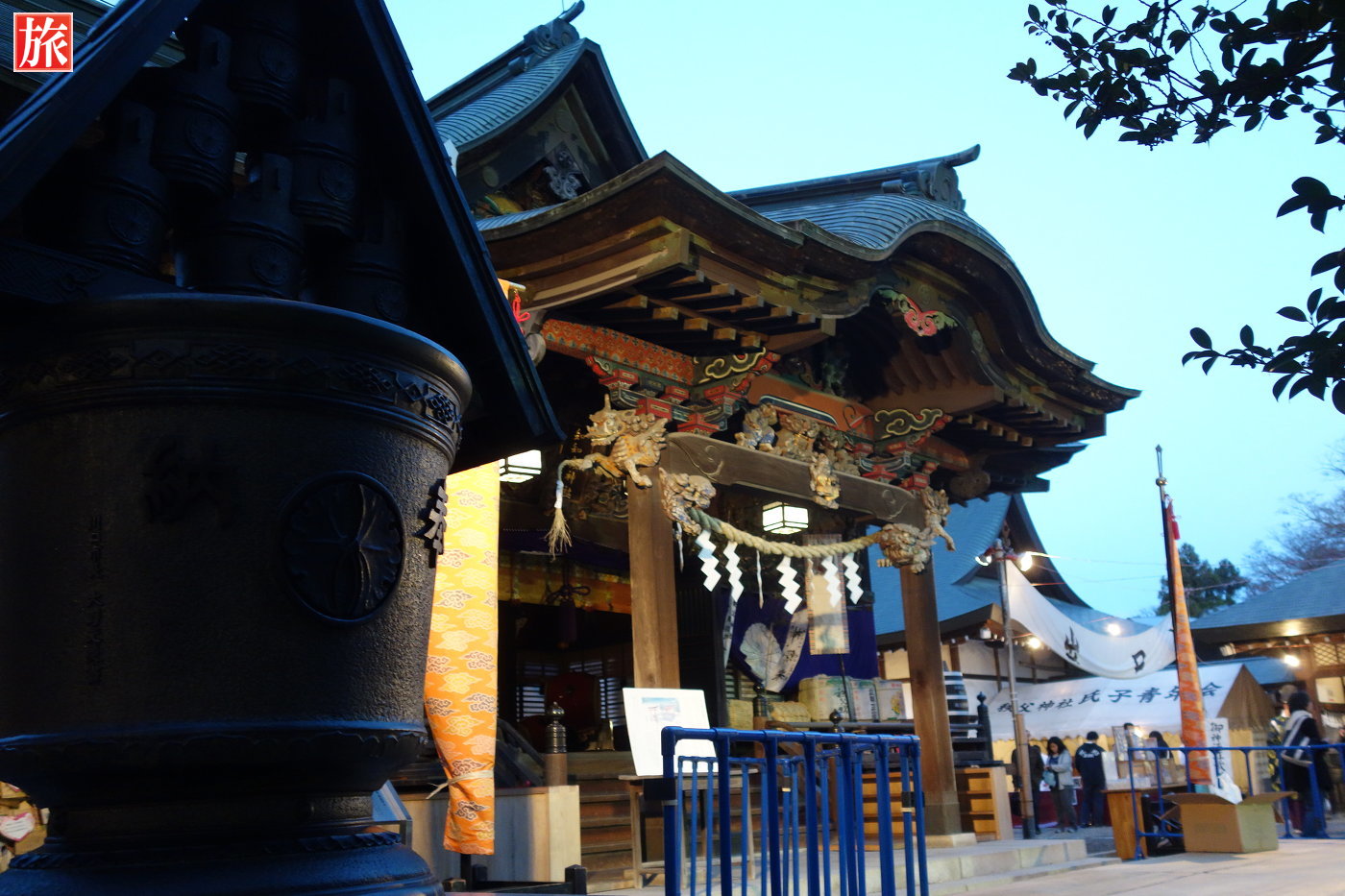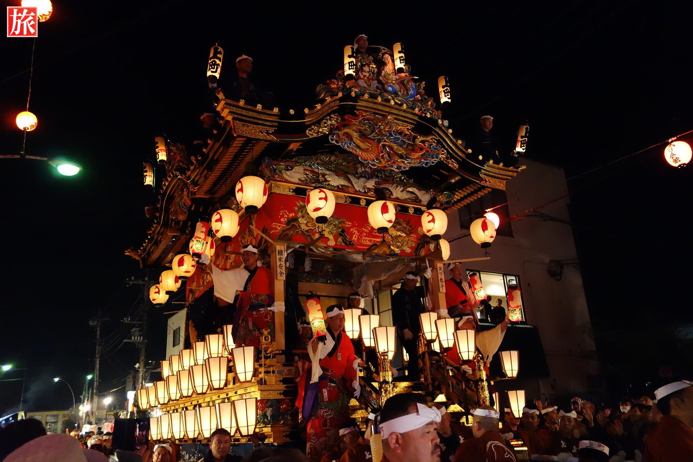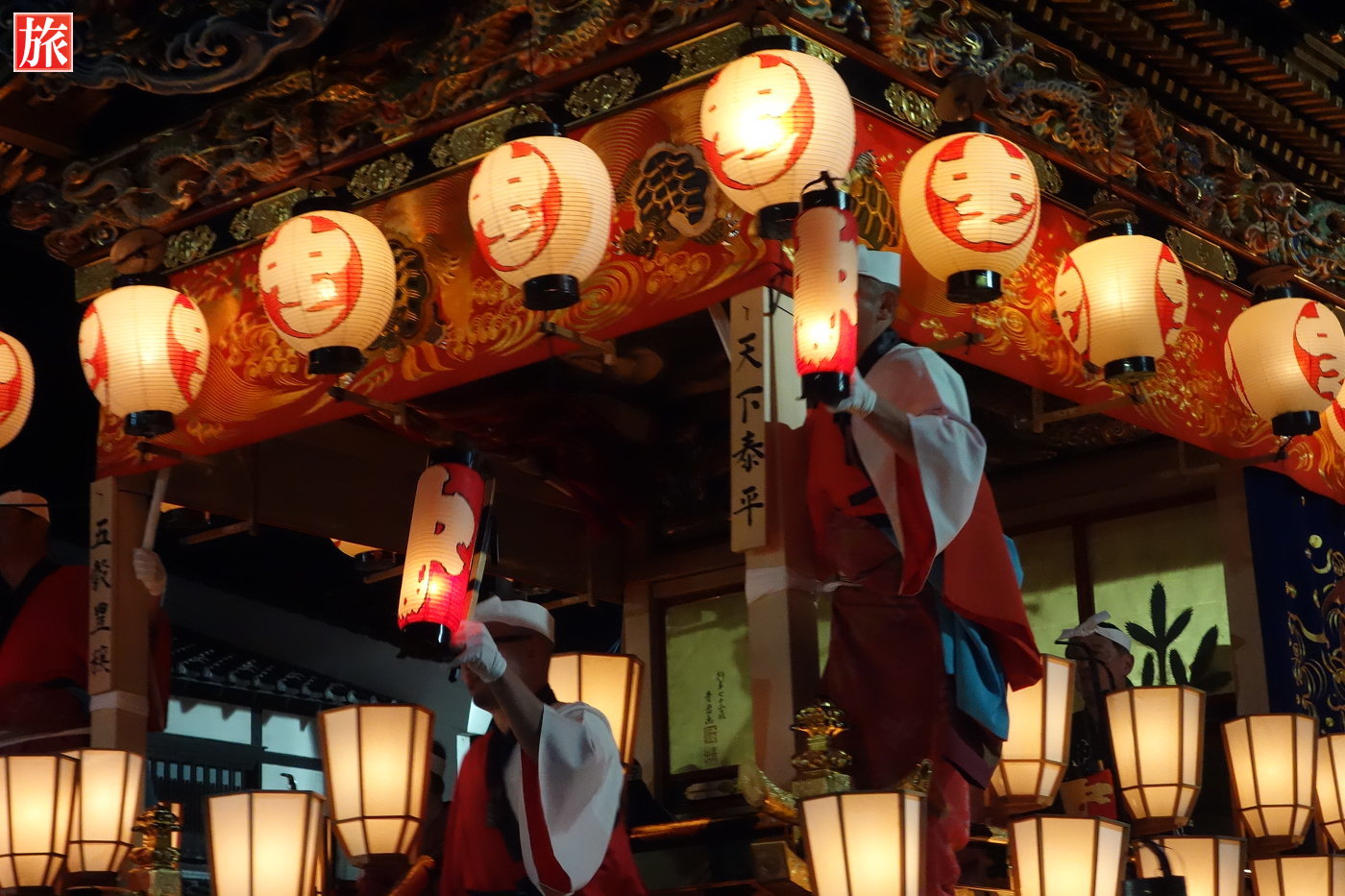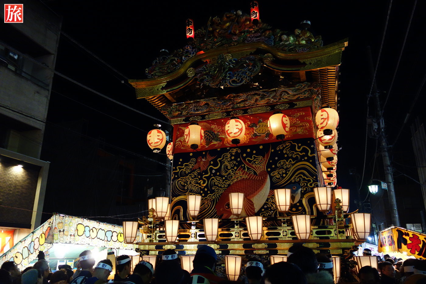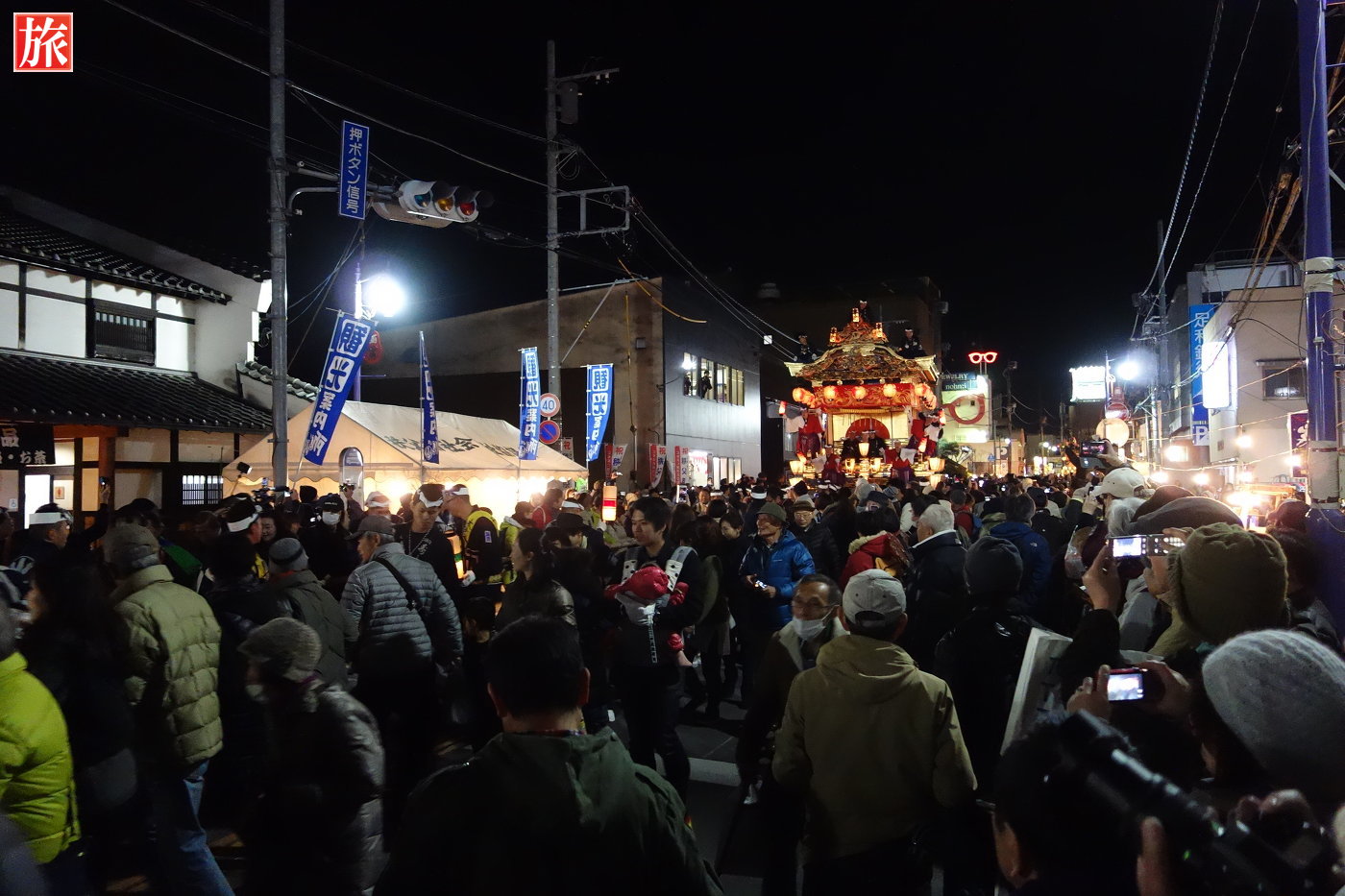 12月の例祭は 京都祇園祭、飛騨高山祭と共に日本三大曳山祭の1つとして有名です。今日は宵宮(よいみや)で朝から山車の曳きまわしが行われ山車、4基が市内を曳行します。明日の大祭(たいさい)では朝から山車の曳きまわしが行われ、6基の山車が勢ぞろいします。