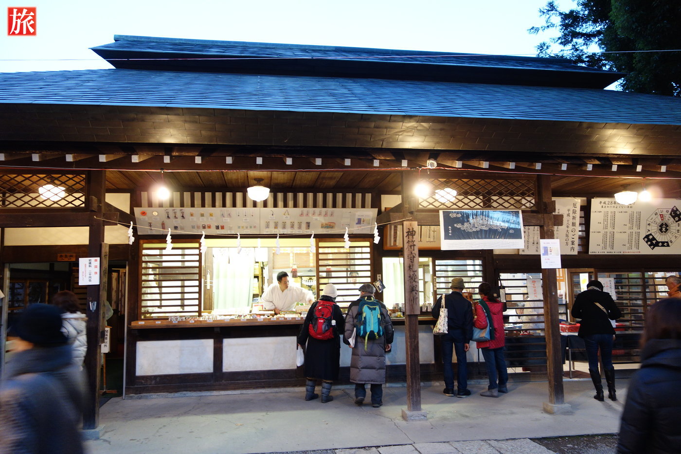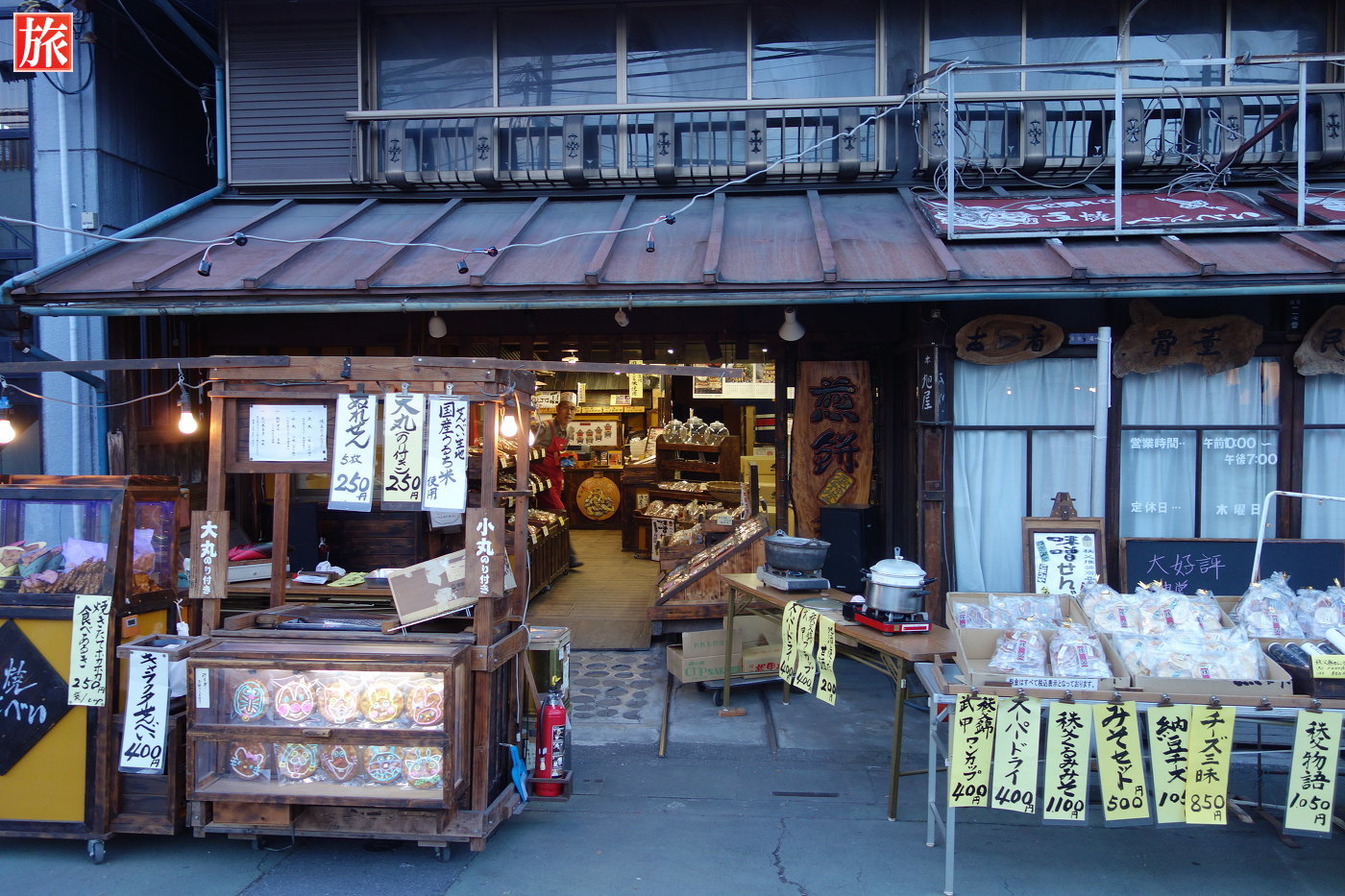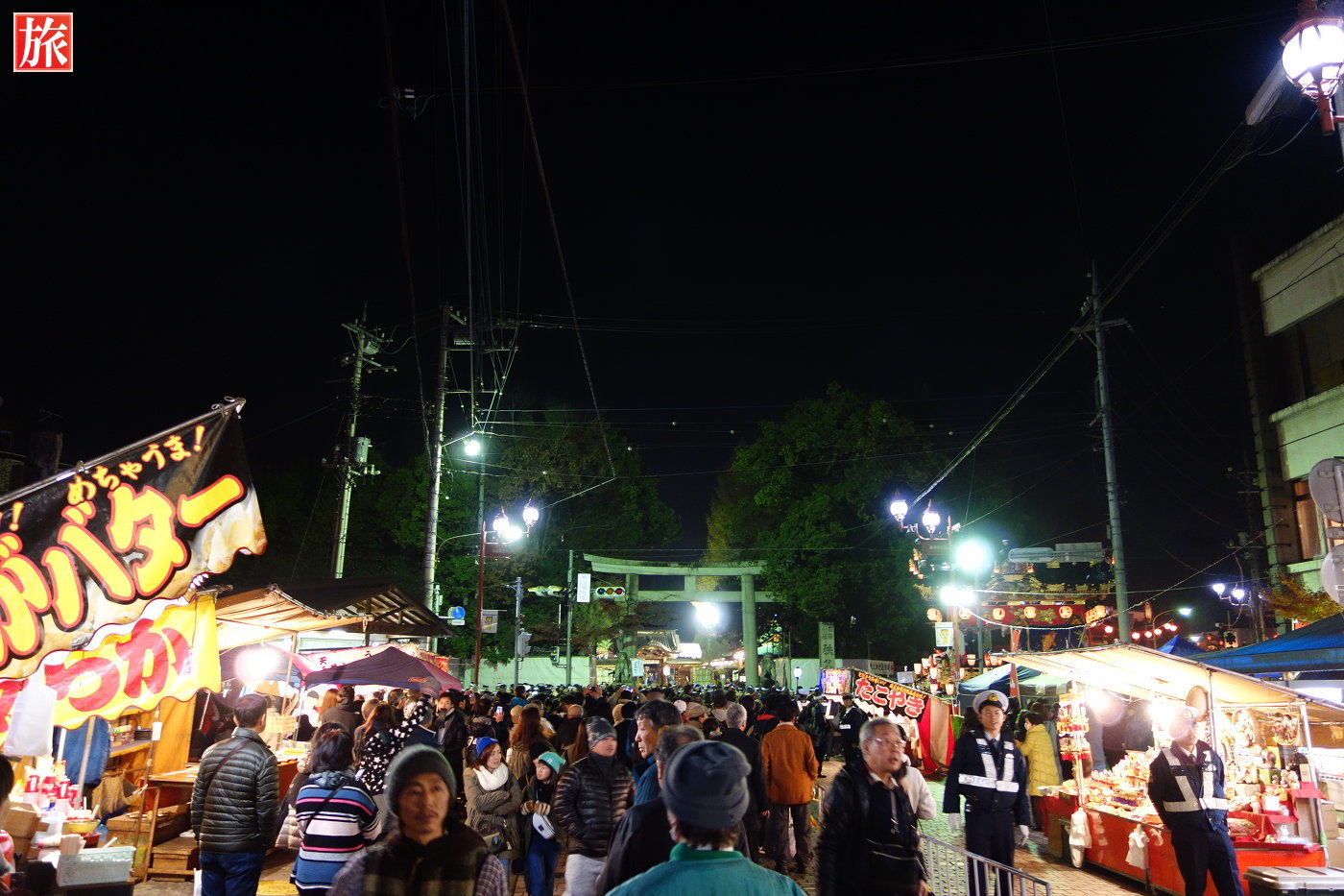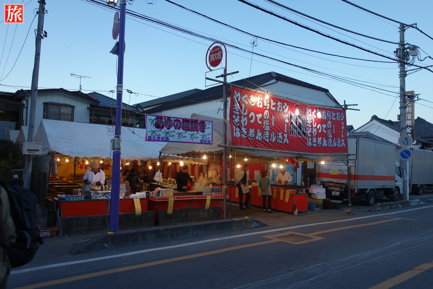 懐かしいお煎餅屋さん。秩父夜祭前の出店。正面に社務所。日暮れ前に秩父神社に到着。