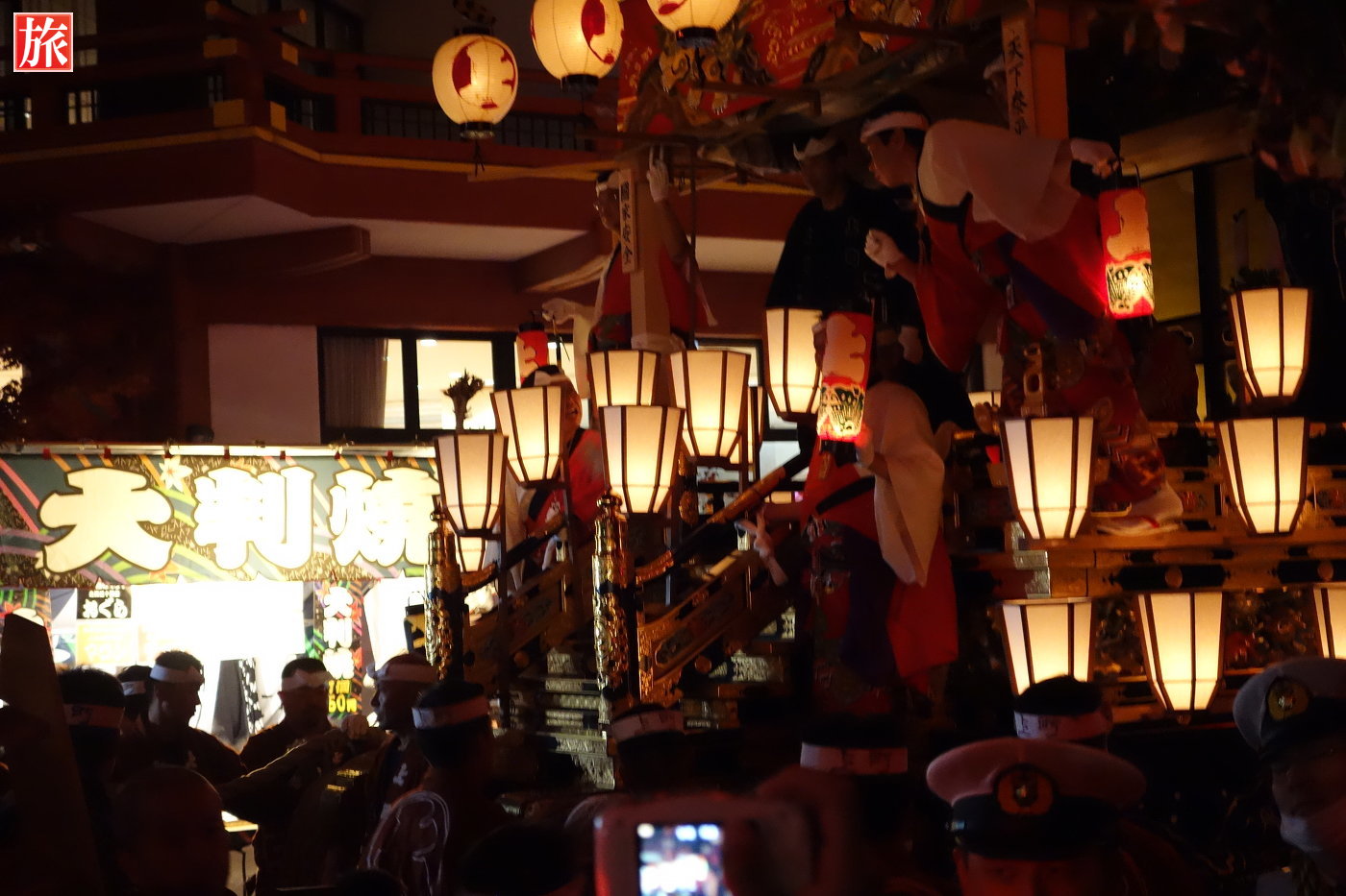 中町屋台、提灯がいい感じ!屋台の後ろには鯛?が描かれています。上町屋台が通ります・・・・
