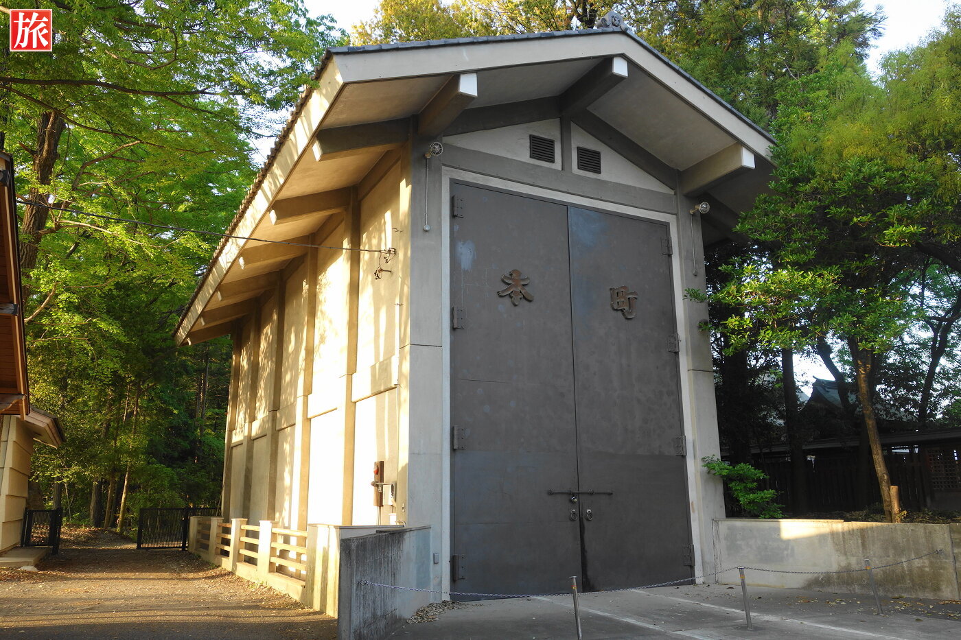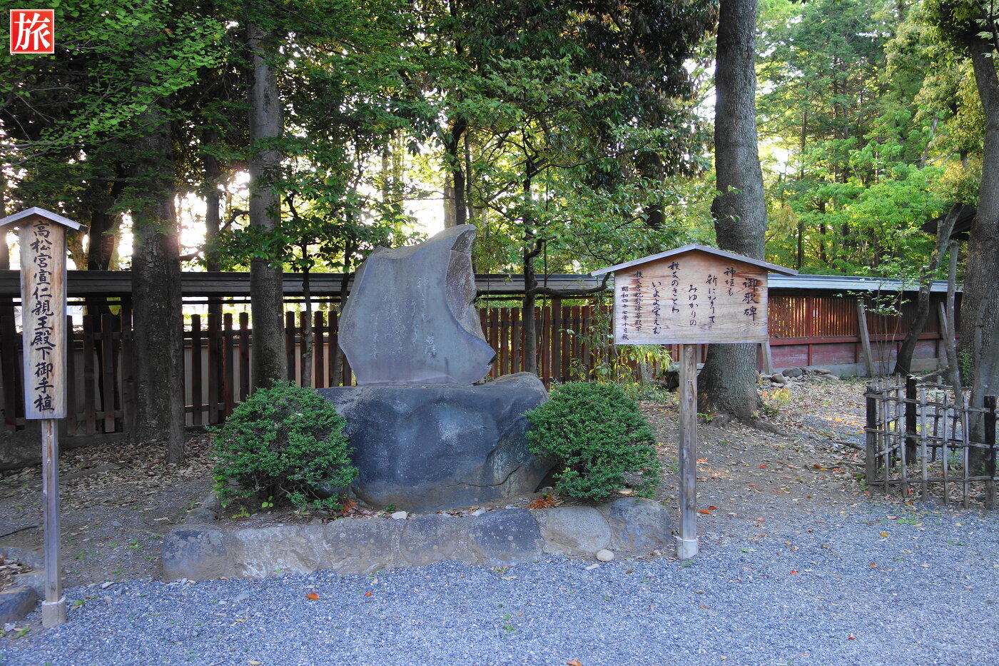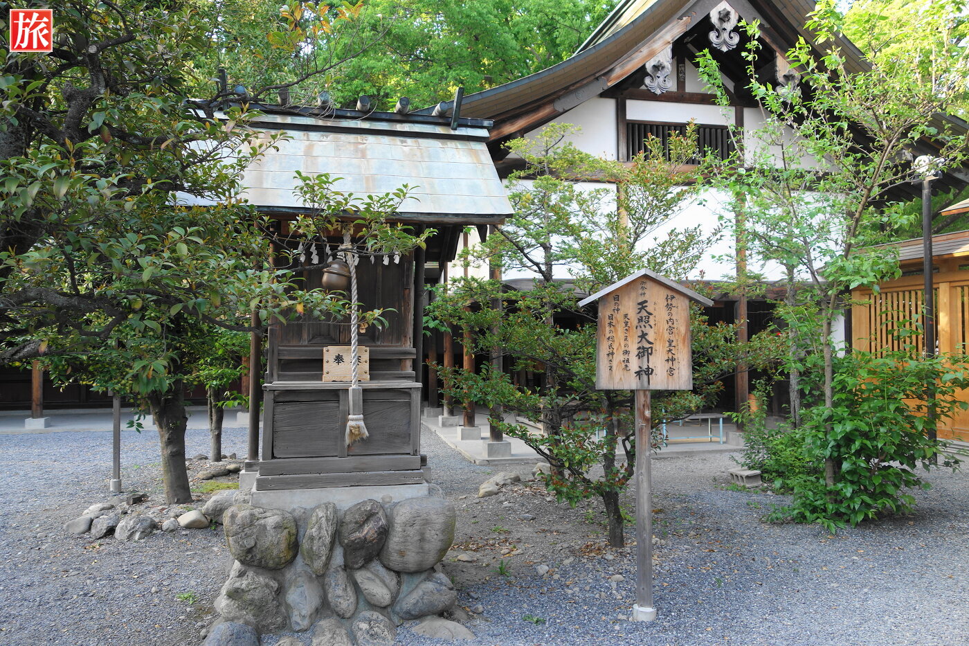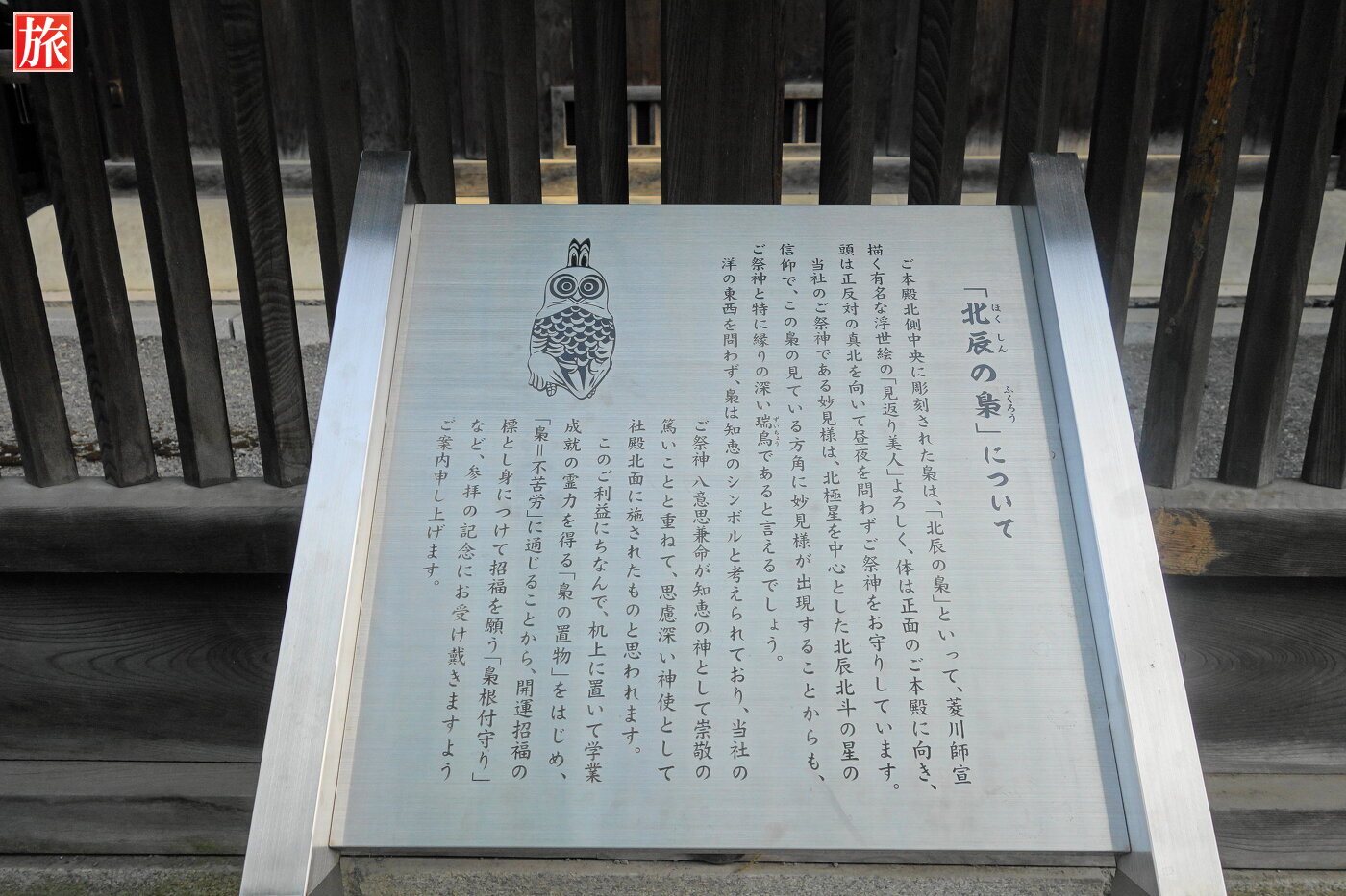 本殿の北側には「北辰の梟」の彫刻が施されています。この梟は、体は本殿方向を向きながら顔だけ正反対を向き、昼夜問わずご祭神をお守りしているそうです。北辰の梟の説明板。皇代神宮。天神地祇社。本殿裏手からみた様子。
