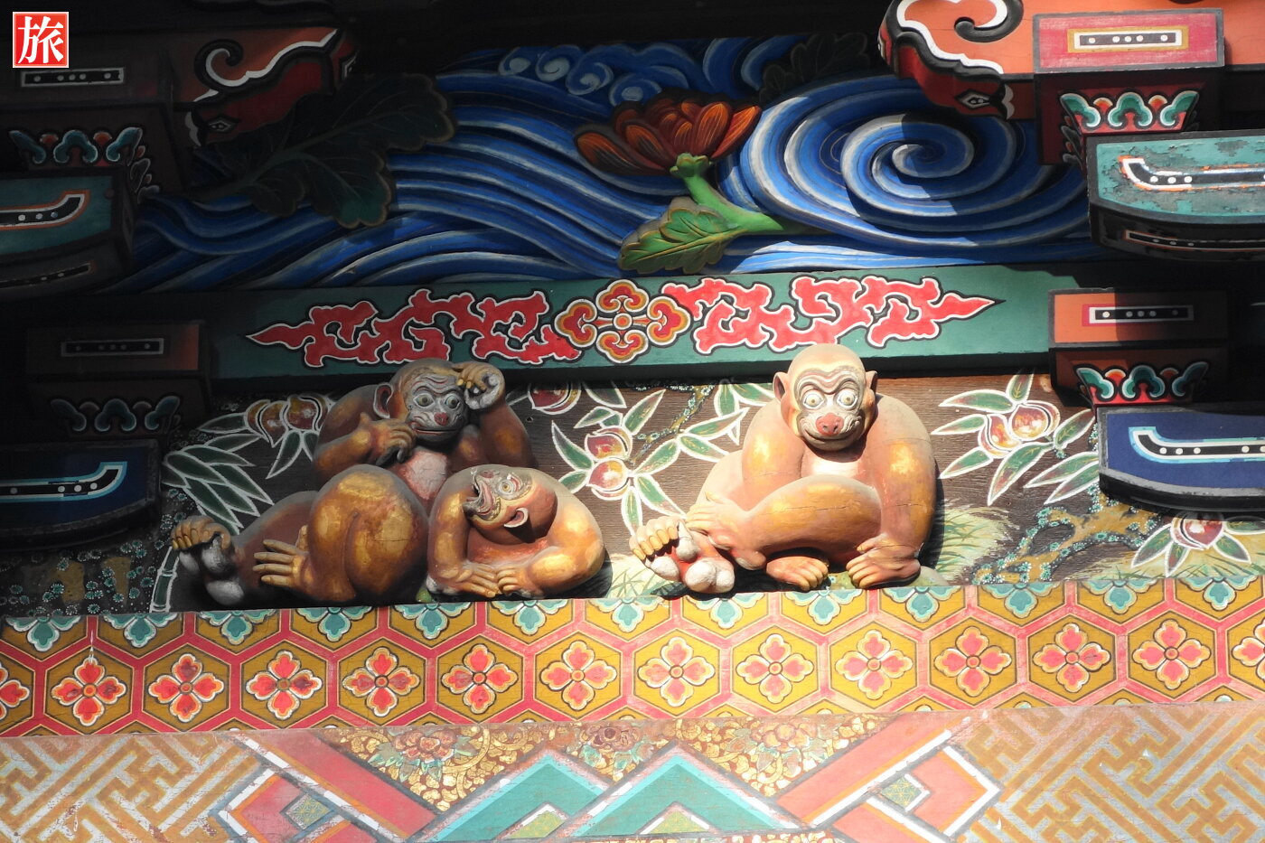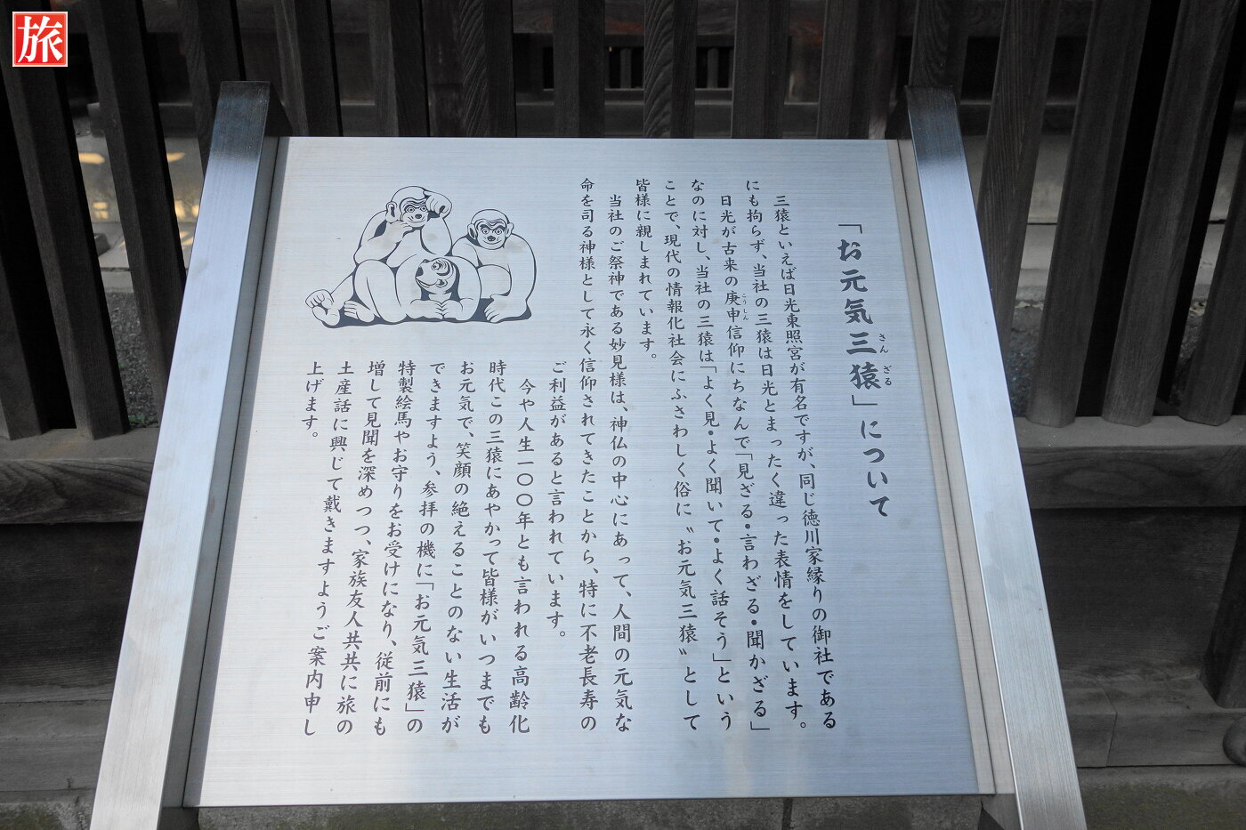 お元気三猿。日光の「見ざる・言わざる・聞かざる」とは対照な表情で、「よく見て・よく聞いて・よく話そう」ということでお元気三猿と言われているそうです。こちらも左甚五郎作。お元気三猿についての説明。