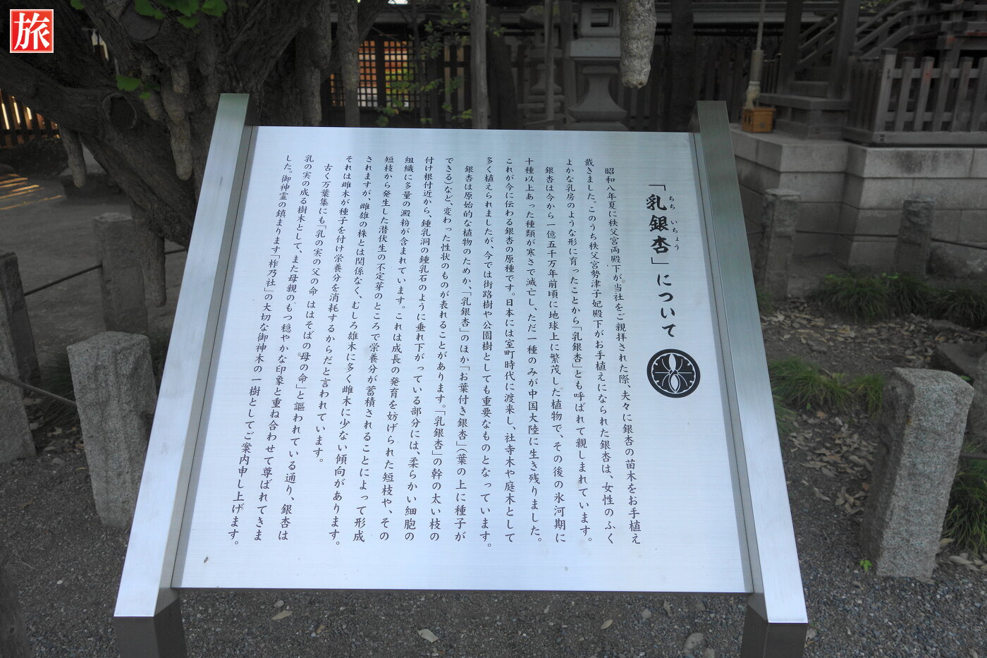 秩父宮妃殿下御手植銀杏。この銀杏を触ると、女性の病気が治るといわれています。乳銀杏についての説明。