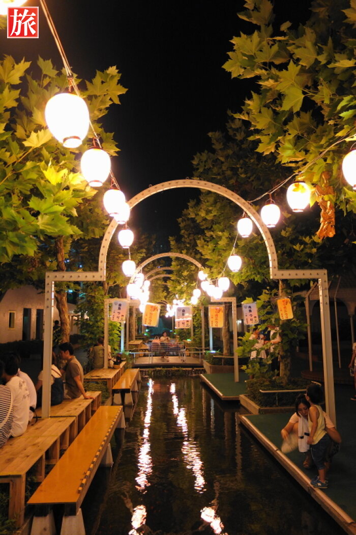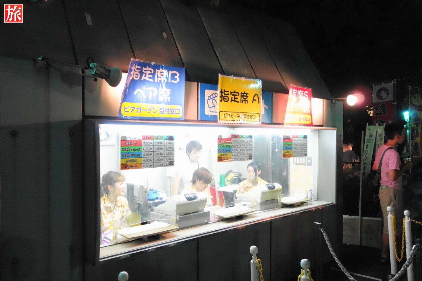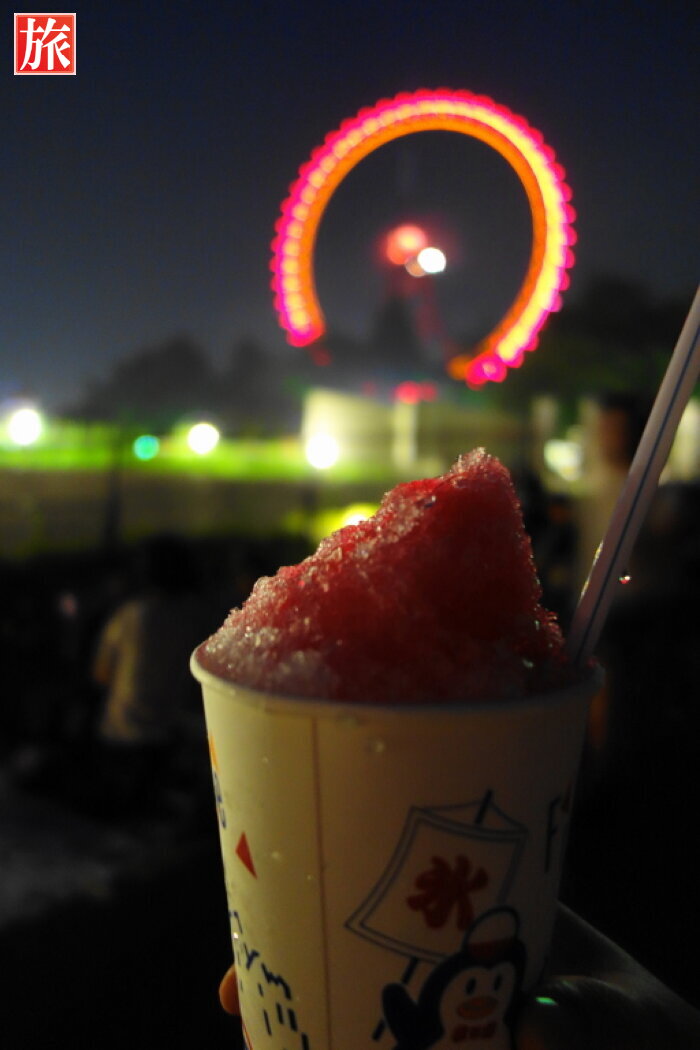 『ビアガーデン』有料指定席の入場口です。ビアガーデンの様子と観覧車。ビアガーデンの西側に陣を取りました。屋台で買ったかき氷。