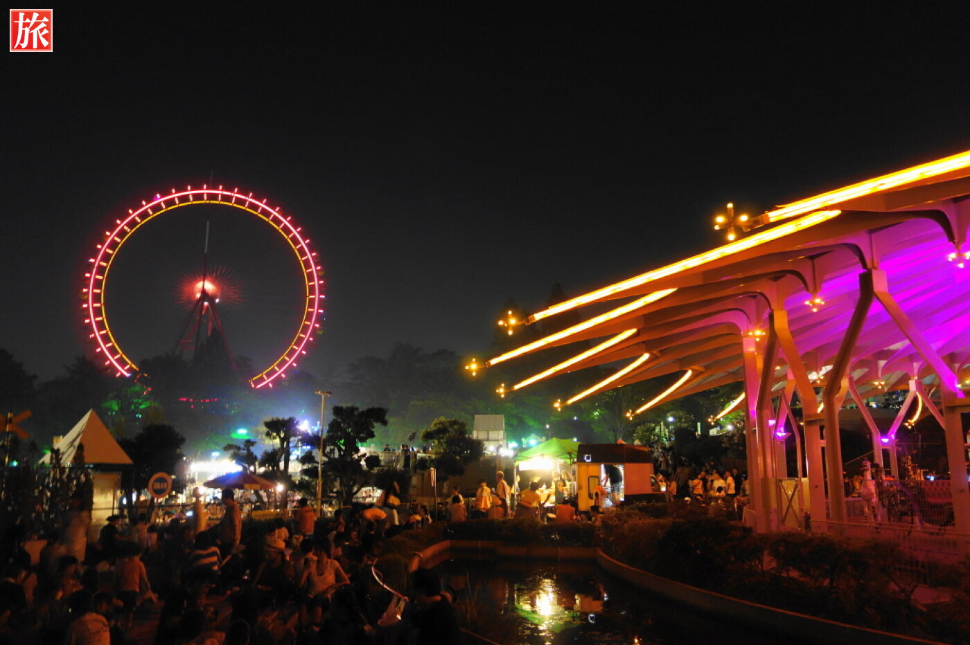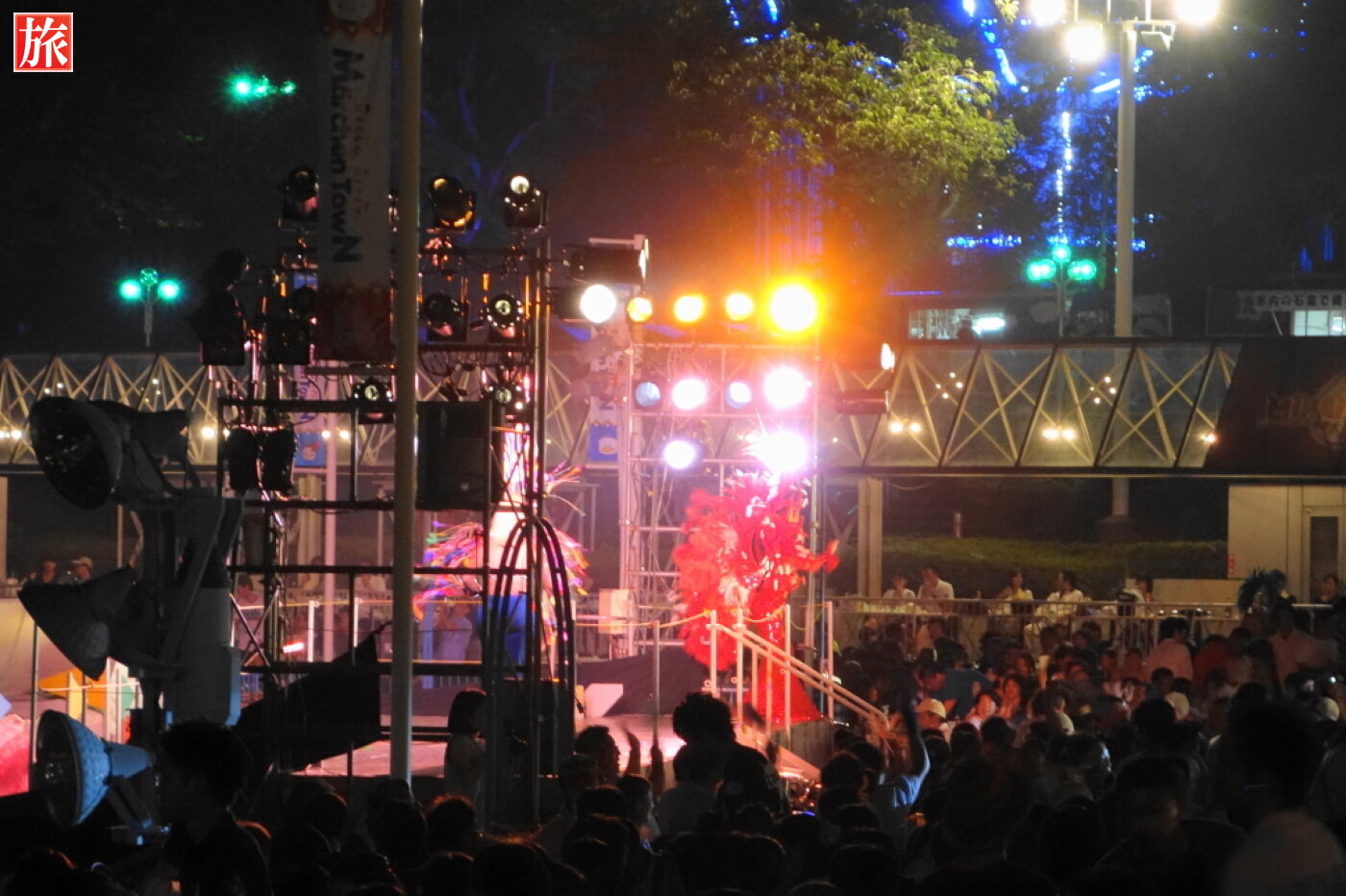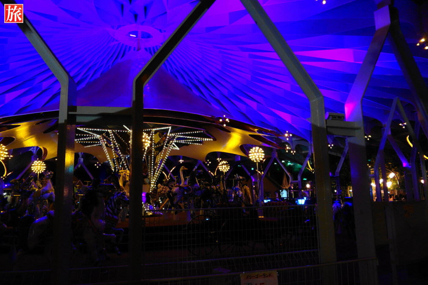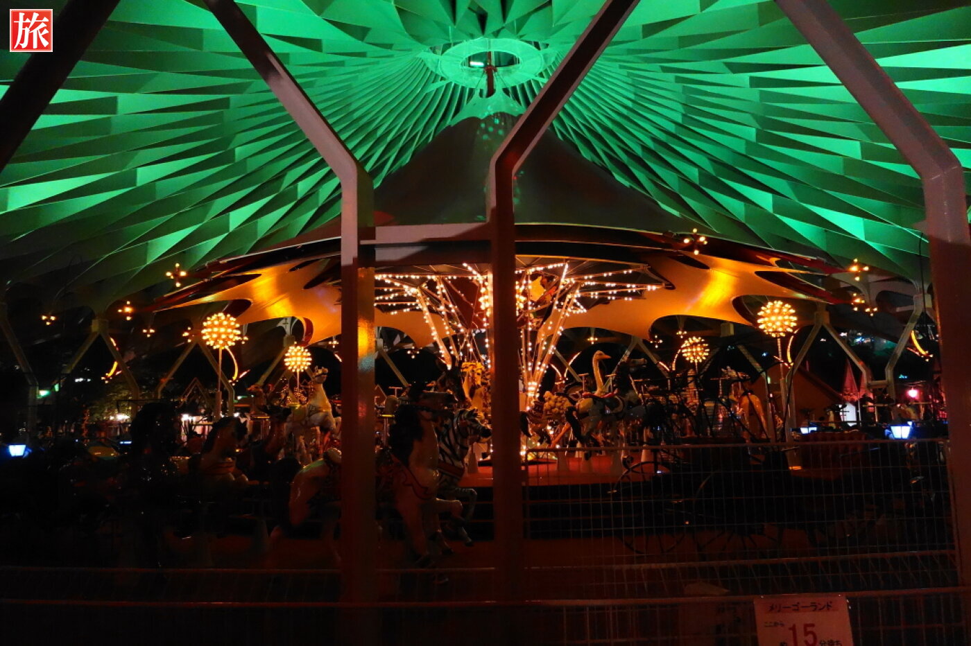 メリーゴーランドの照明。色が次々と変わります。『ビアガーデン』ステージショーで行われているリオのカーニバル。メルヘンショップ付近から観覧車を望む。