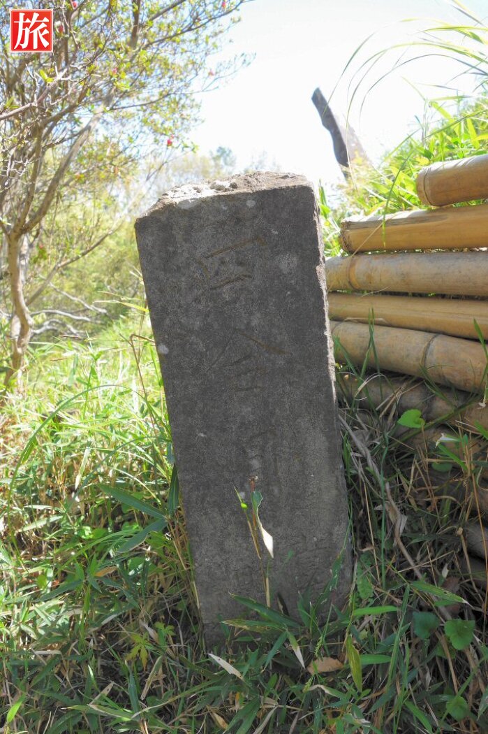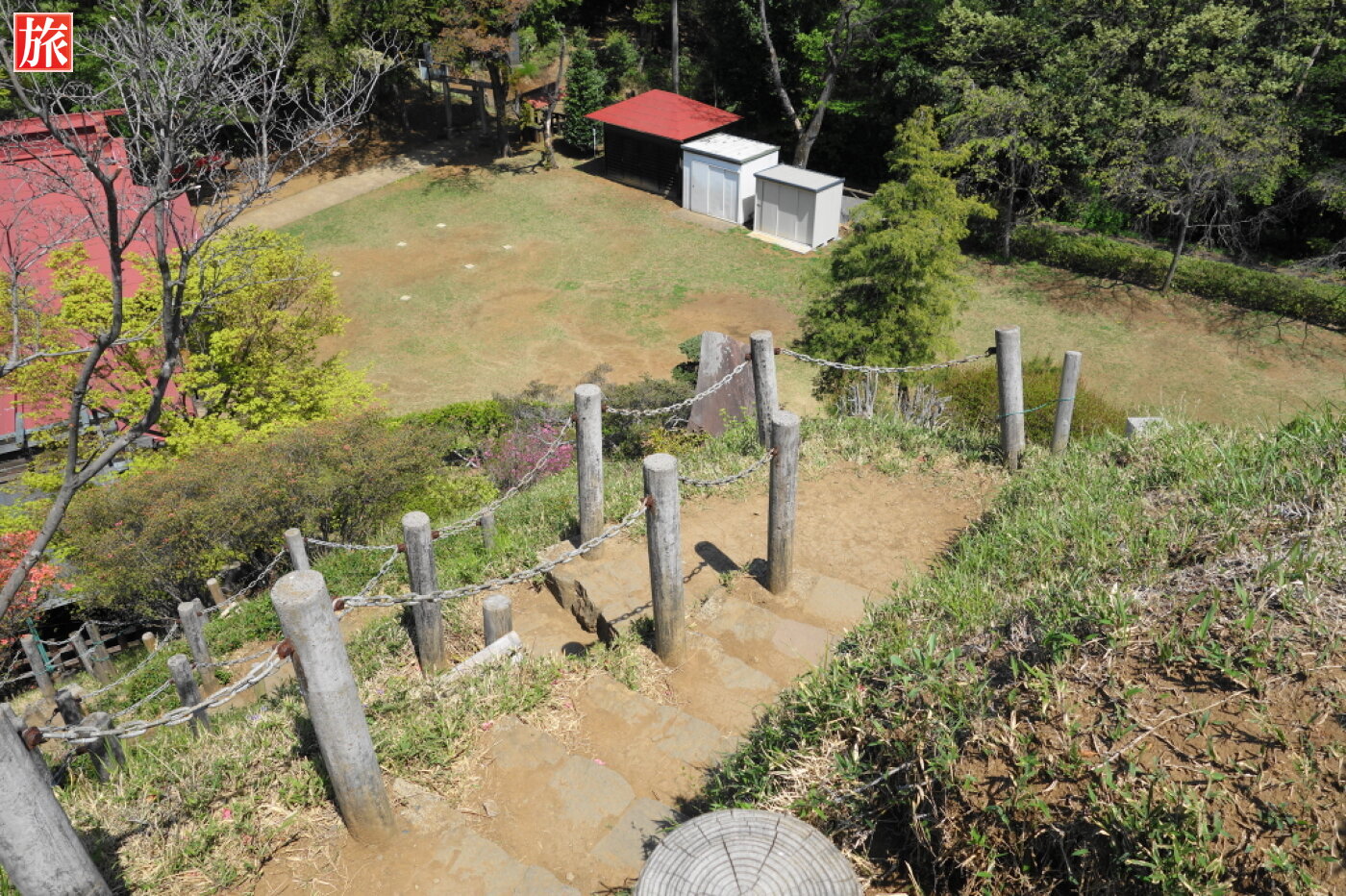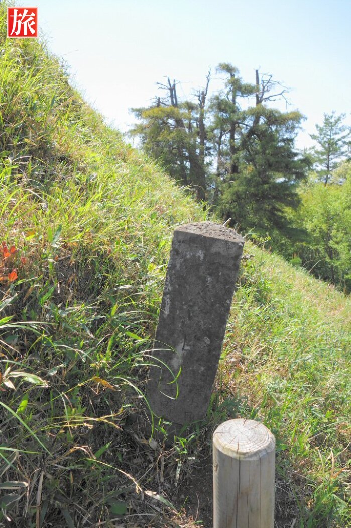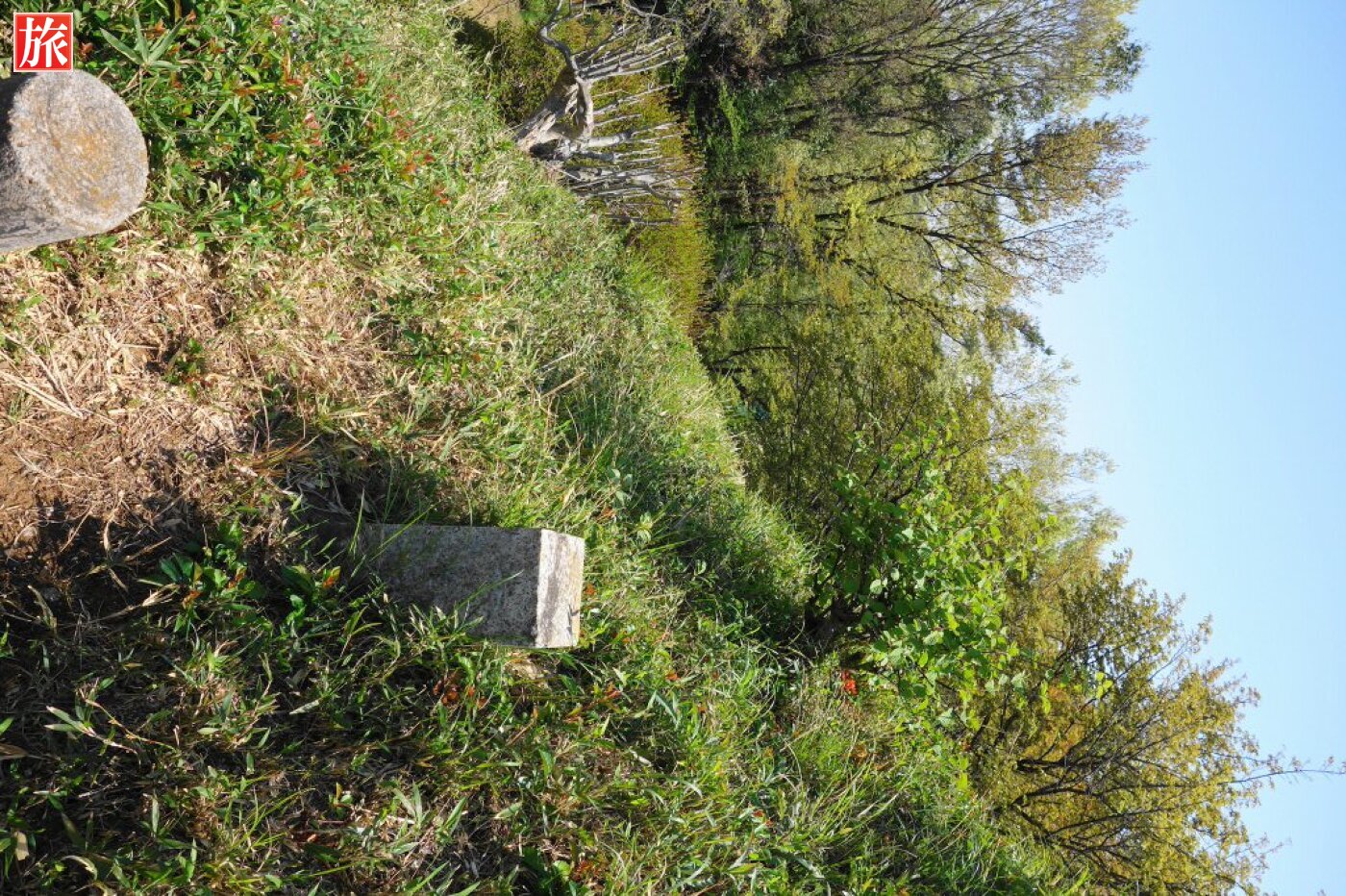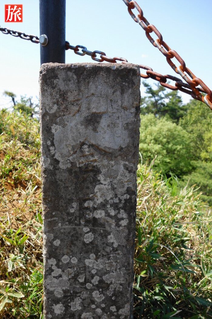 9合目から登ってきた坂を見た様子。山頂まで、転落防止の鎖がトラロープになっています。山頂(標高119.4m)へ到着・山頂の祠。