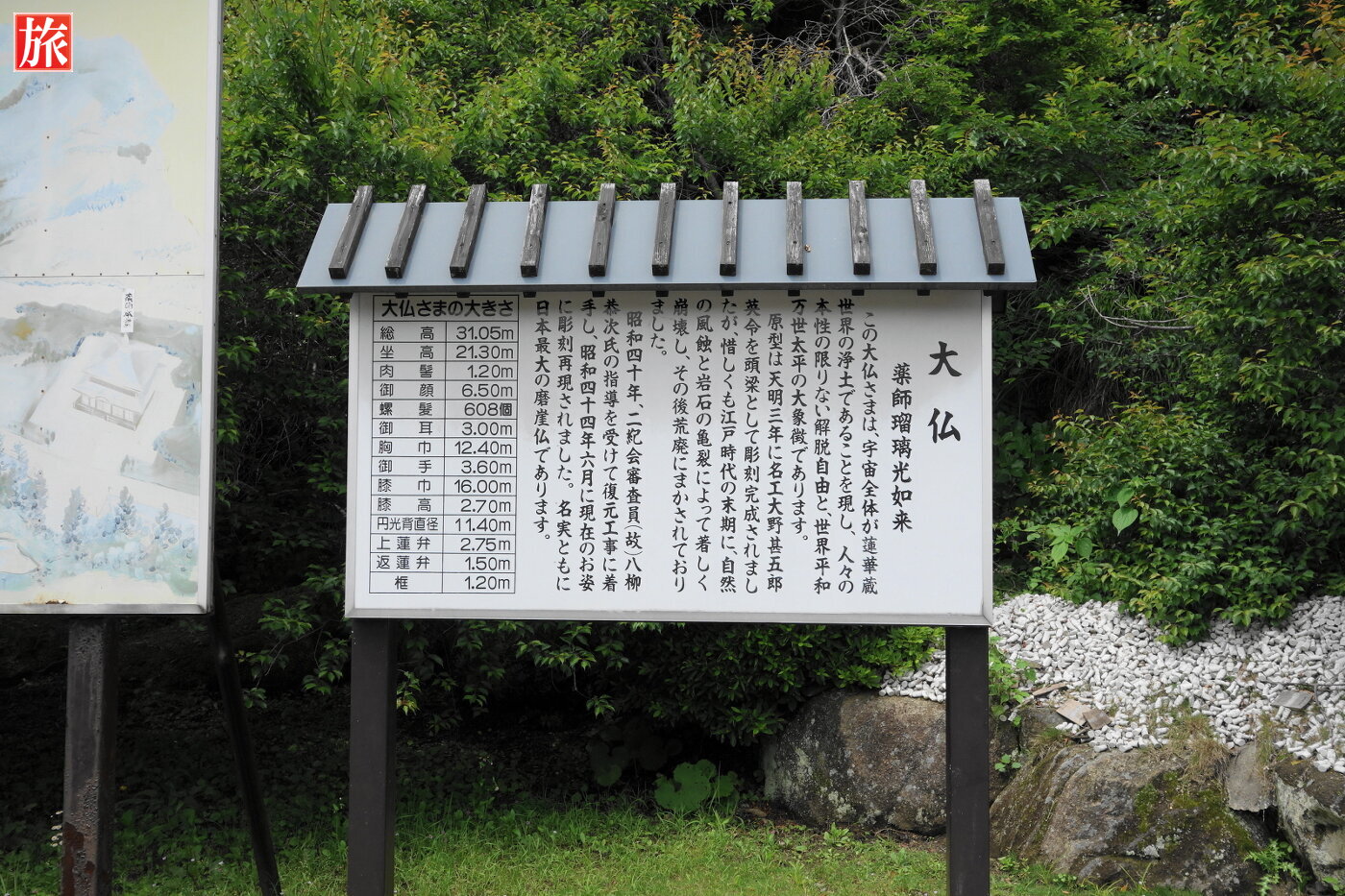 東口管理所より徒歩5分の場所に像高31.0mの日本寺大仏があります。石仏としては日本一の高さを誇ります。ちなみに奈良の大仏は像高約18m、鎌倉大仏は像高約13m(台座を含め・銅造)です。大仏(薬師瑠璃光如来)。大仏の説明。