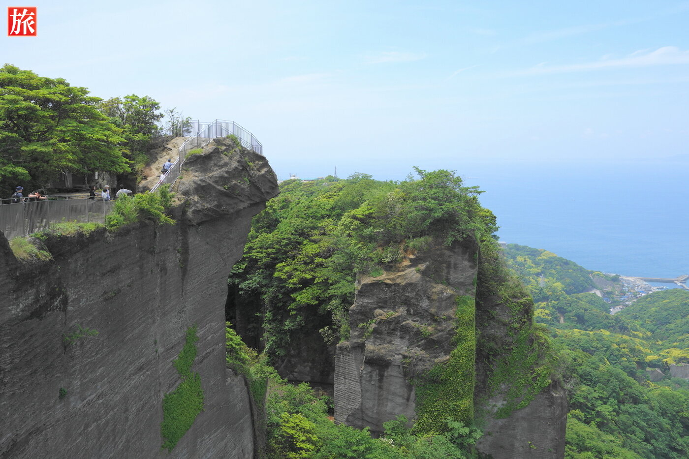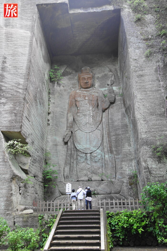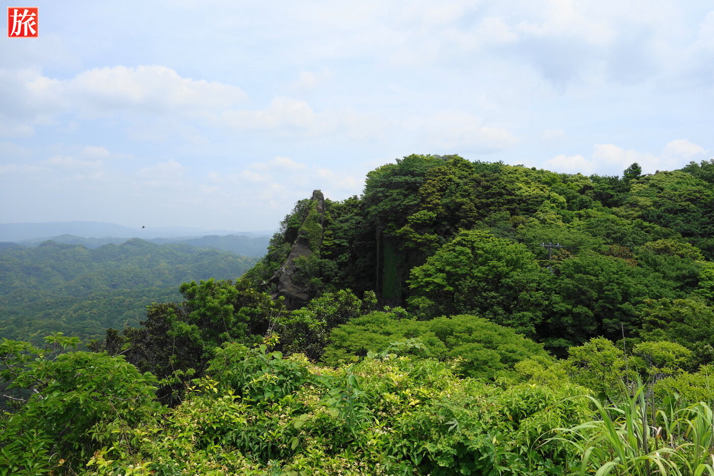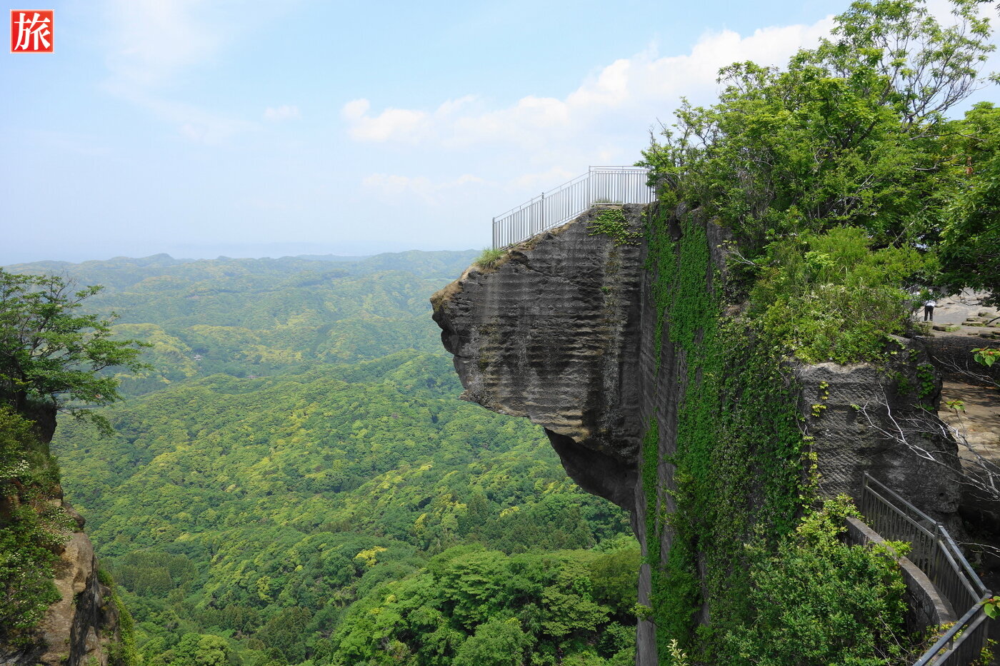 その名のとおりノコギリの歯のような稜線をもつ山で、山頂までをロープウェイが結んでいる。山頂駅から5分ほどの日本寺はこの山の最大の見どころ。とりわけ境内を15分ほど進んだ断崖には、高さ31mの巨大な磨崖仏があり、これは奈良の大仏の2倍近い大きさ。