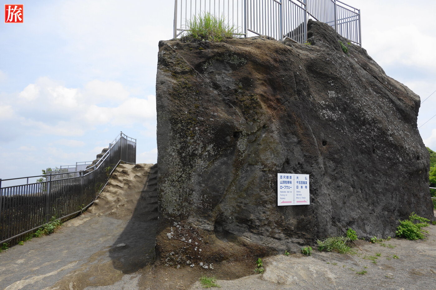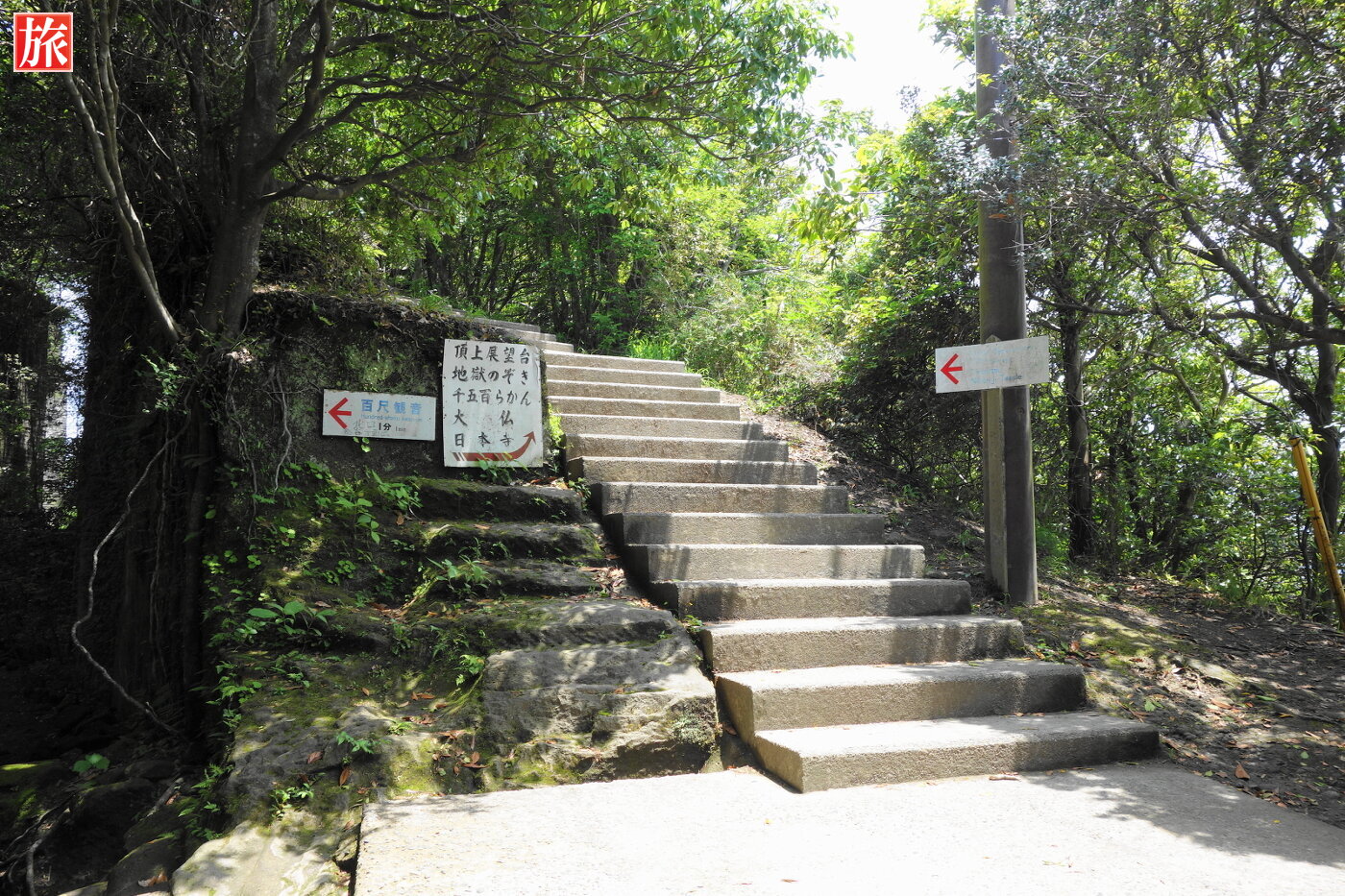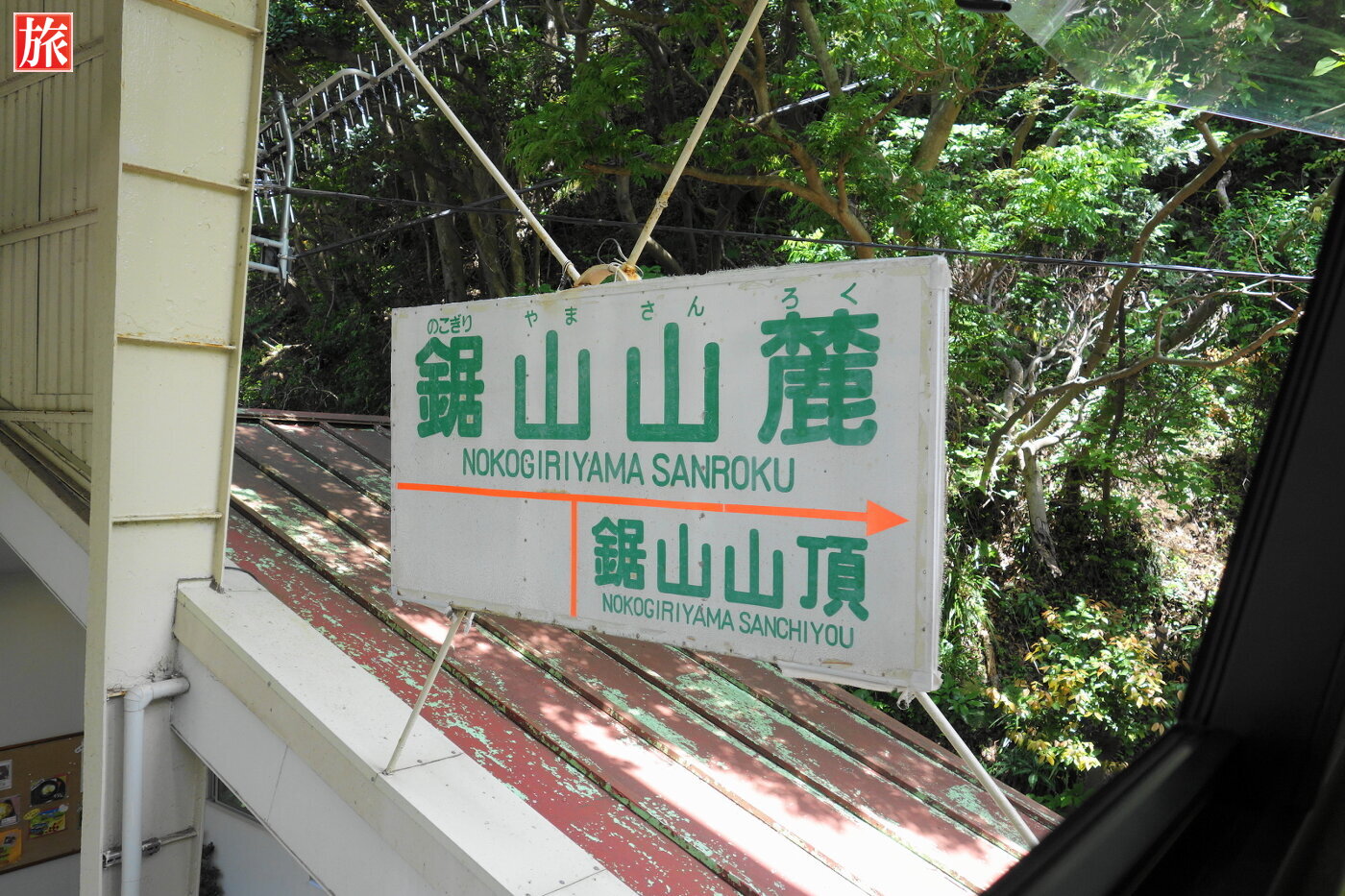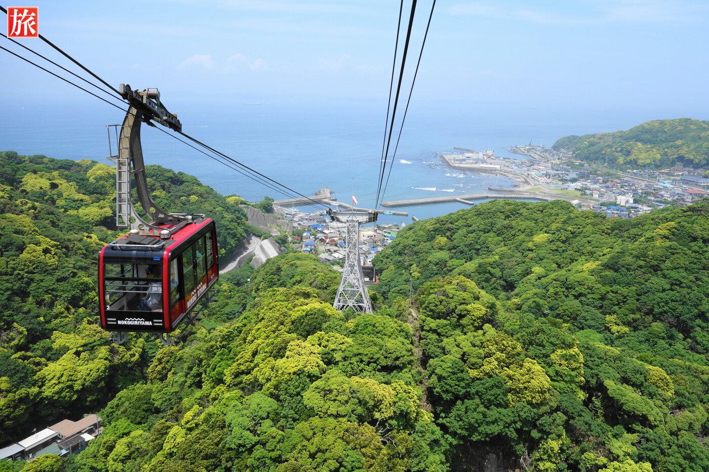 その名のとおりノコギリの歯のような稜線をもつ山で、山頂までをロープウェイが結んでいる。山頂駅から5分ほどの日本寺はこの山の最大の見どころ。とりわけ境内を15分ほど進んだ断崖には、高さ31mの巨大な磨崖仏があり、これは奈良の大仏の2倍近い大きさ。