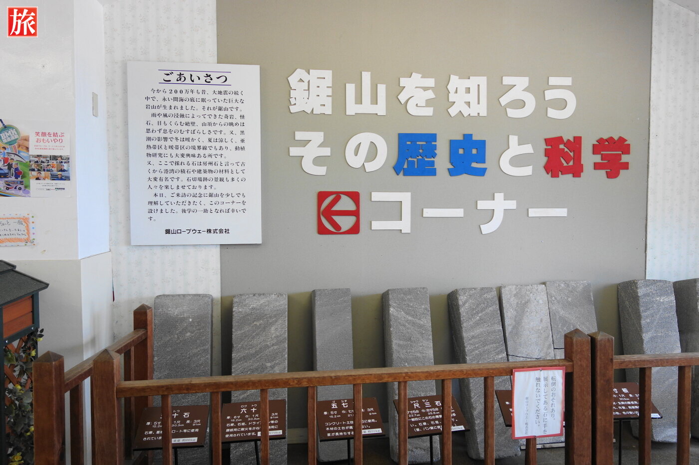 山頂展望食堂内にある、石切り資料コーナー。展望食堂の様子。山頂駅屋上の展望台からの風景。