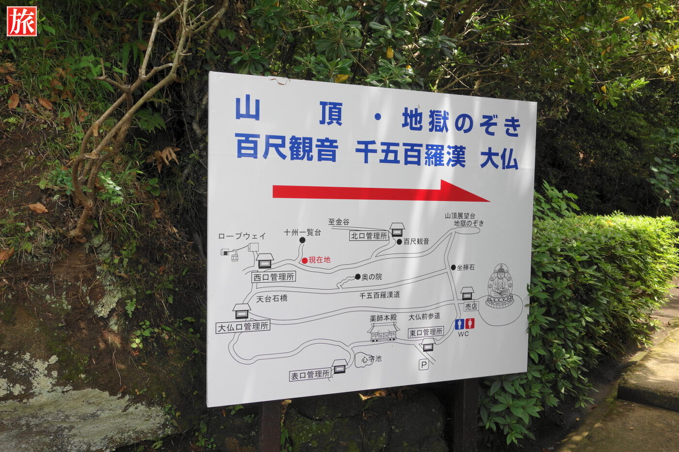 順路の案内板。百尺観音と地獄のぞきの分かれ道。右の階段を登ると地獄のぞきで、左に進むと百尺観音があります。百尺観音を見に切り立った岩肌を進みます。