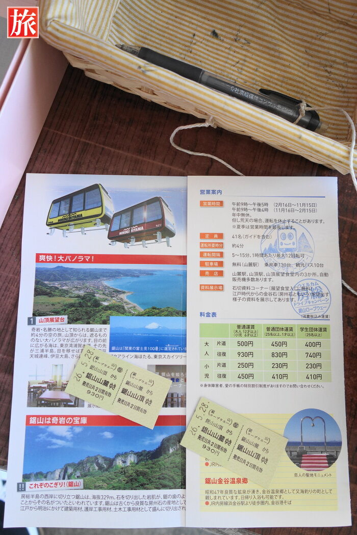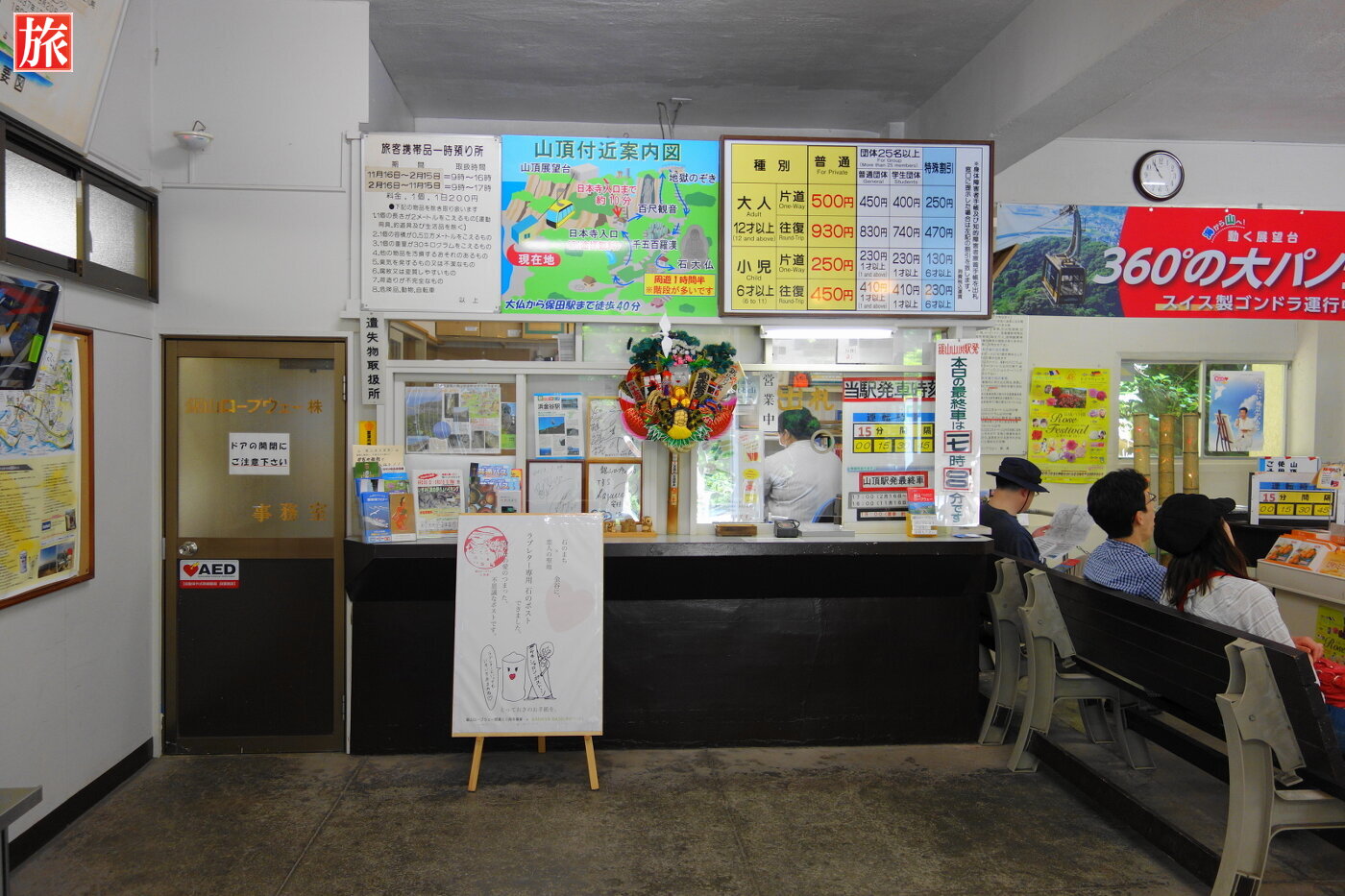 鋸山ロープウェー山麓駅の様子。山頂方向を望む。きっぷ売り場、大人一人片道500円・往復930円です。
