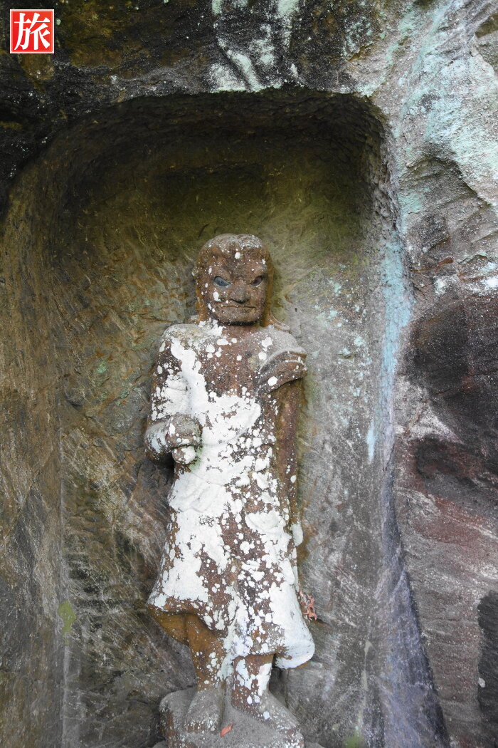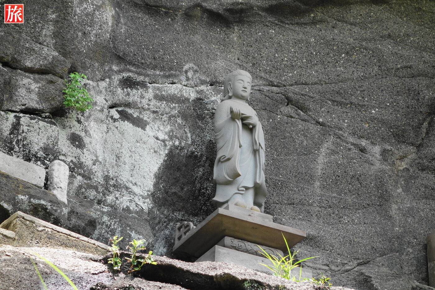 百尺観音(昭和35年から昭和41年にかけて石切場跡に彫刻された観音さま)です。地獄のぞきを見上げた様子。来た道を振り返ると切り立った岩肌がそびえています。