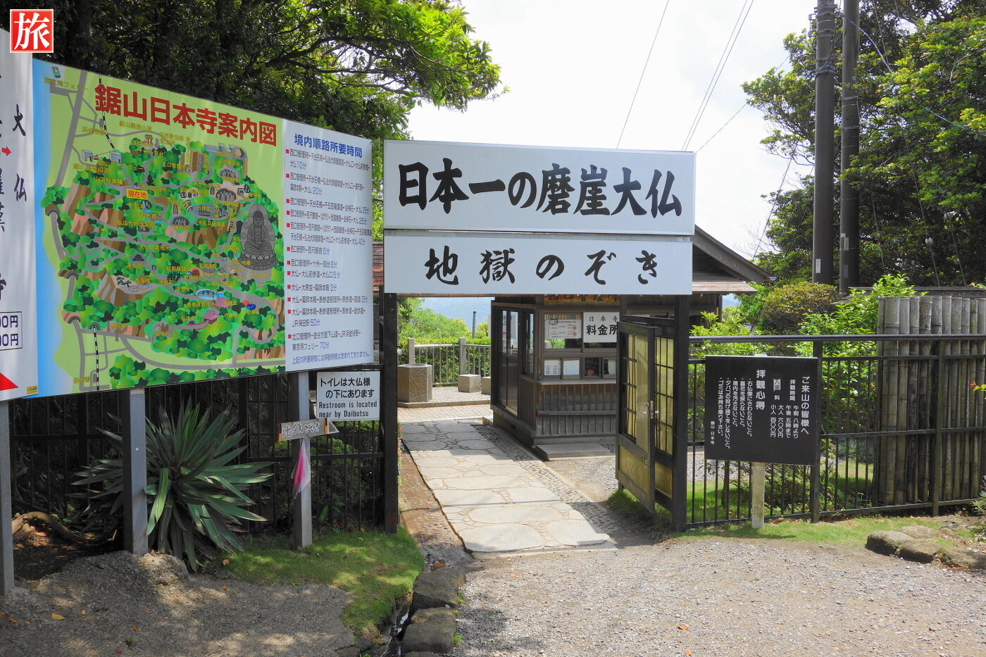 日本寺は鋸山の南斜面に広さ約10万坪の境内が広がり、5つのエリア「山頂エリア」「羅漢エリア」「大仏広場」「中腹エリア」「表参道エリア」に別れています。日本一の高さを誇る磨崖仏、高さが日本一(石仏)の日本寺大仏、岩窟に並ぶ石仏群、地獄のぞきなど見どころも多い古刹 でした。境内出入口(管理所) は全部で5か所ありました。今回は西口と東口から境内へ入りました。