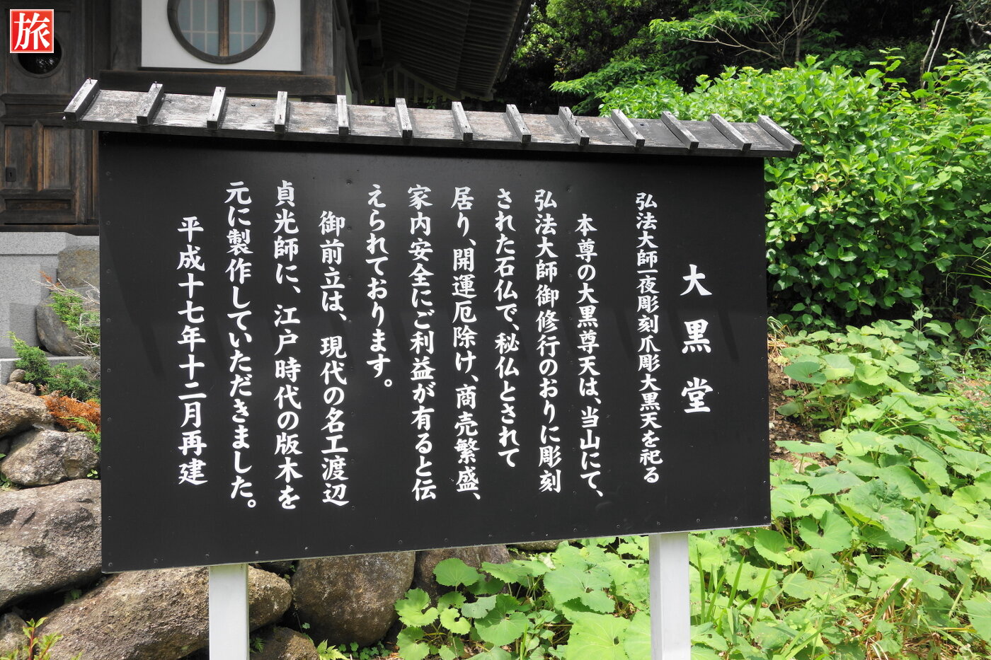 東口管理所(境内出入口)です。西口管理所で拝観料を支払ったことを告げ、チケットを提示すればこちらでは拝観料はかかりませんでした。すぐにある大黒堂。大黒堂の案内板。売店。