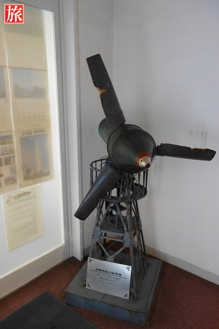 地元の「神島灯台」で使われていた副灯のレンズ。烏帽子島灯台で使われていた第2等フレネル式レンズ。三宅島・サタドー岬灯台で使われていた実験用風力発電機。プレートの説明。