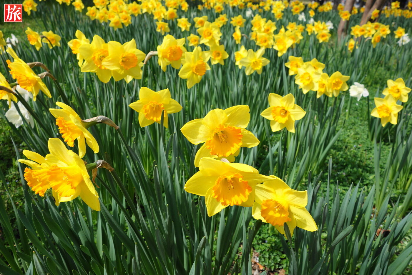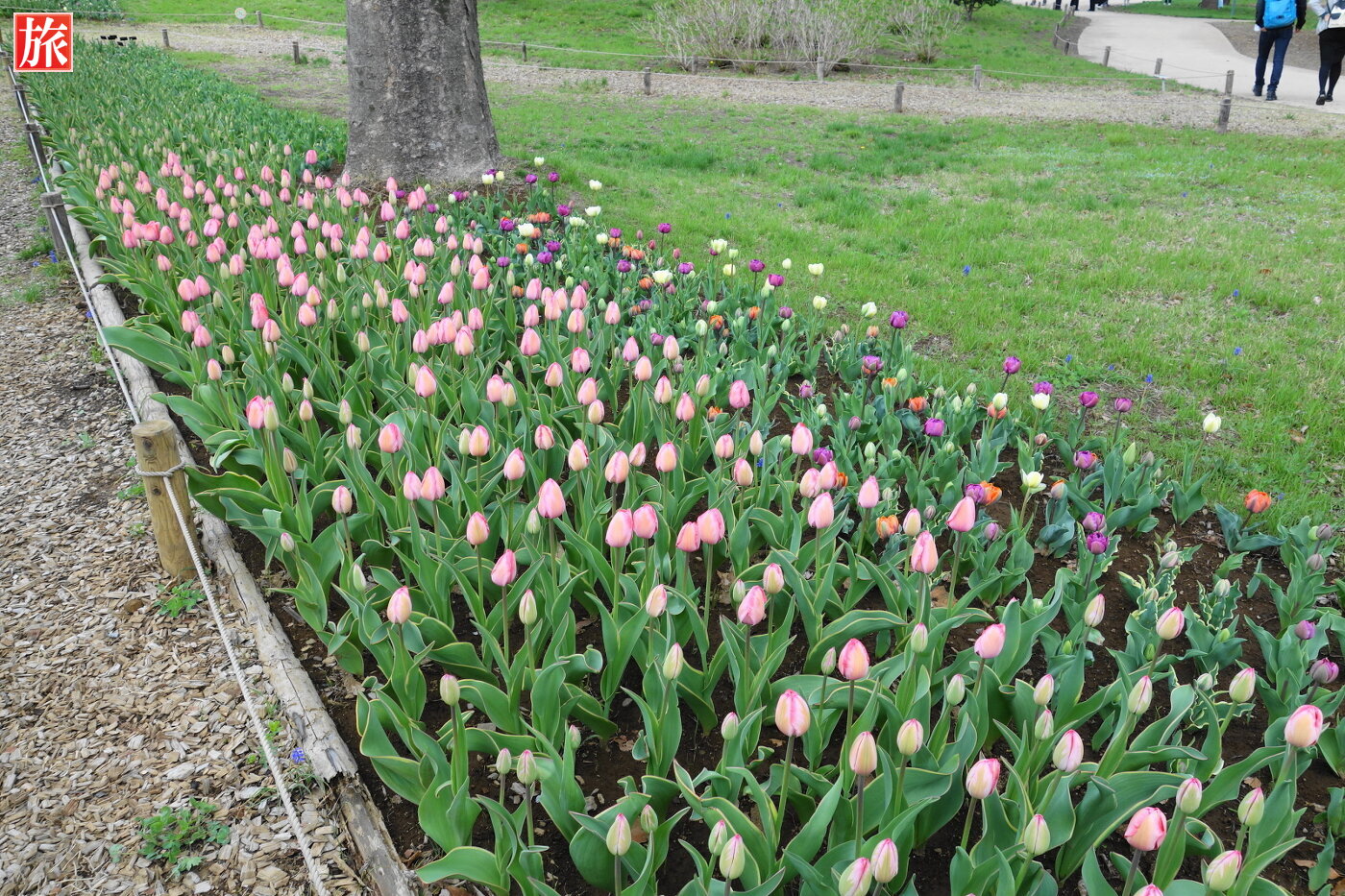 渓流広場。(みんなの原っぱ西側にある総延長700mの渓流広場)このエリアは色々なチューリップが花を咲かせていました。