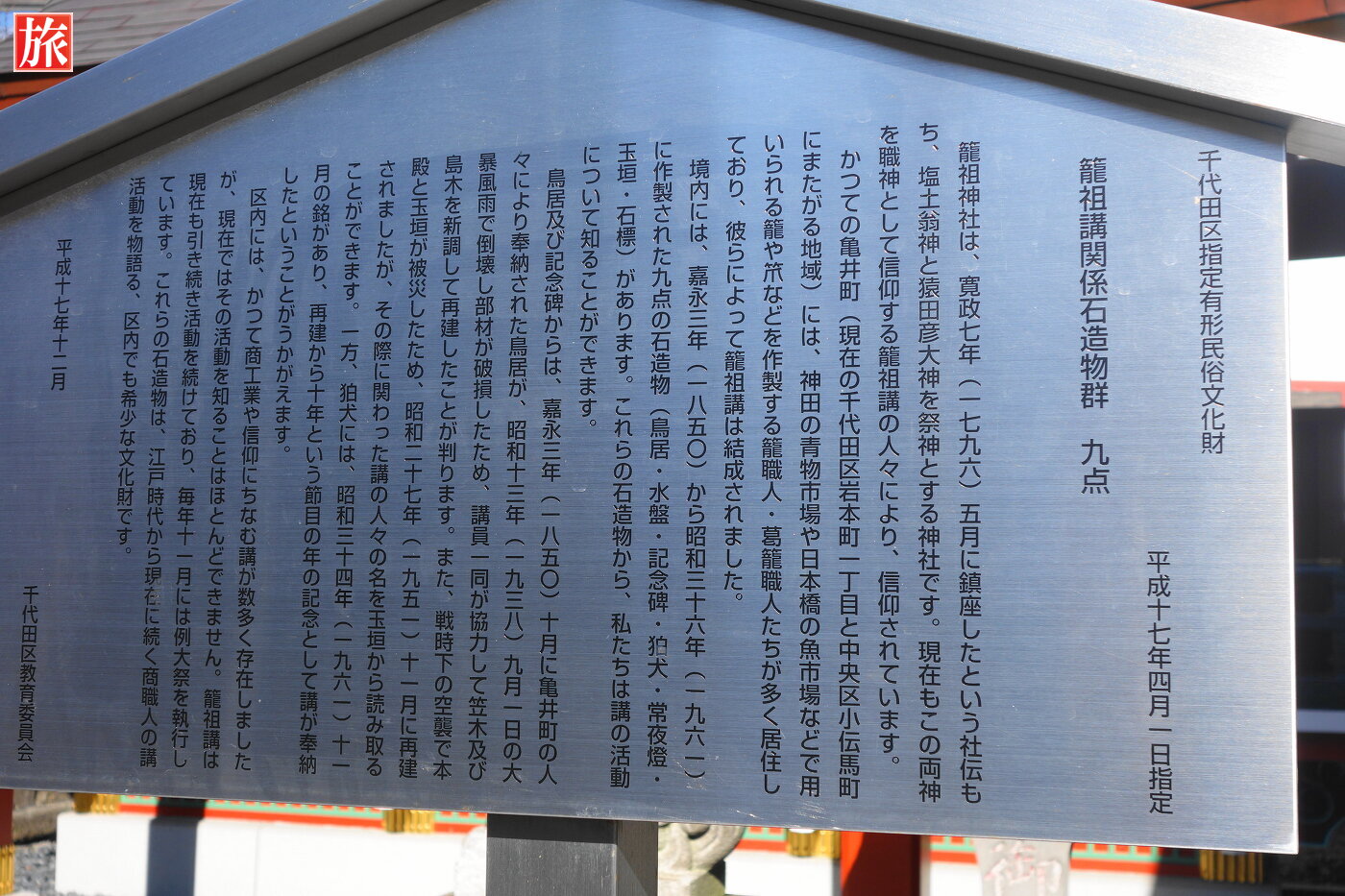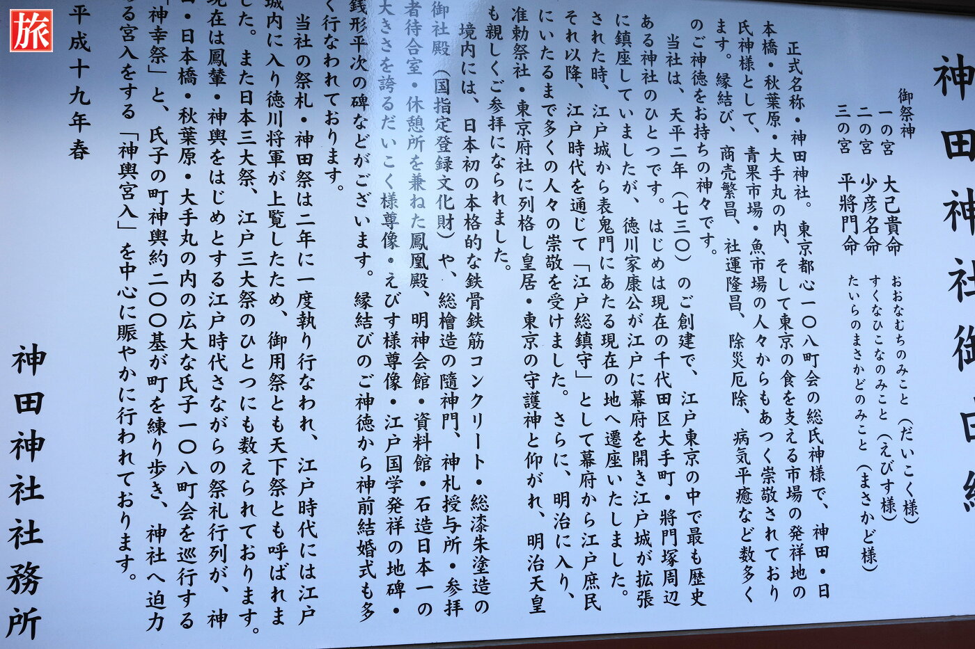神田・日本橋・秋葉原・大手町・丸の内・旧神田市場・築地魚市場など108か町会の総氏神。