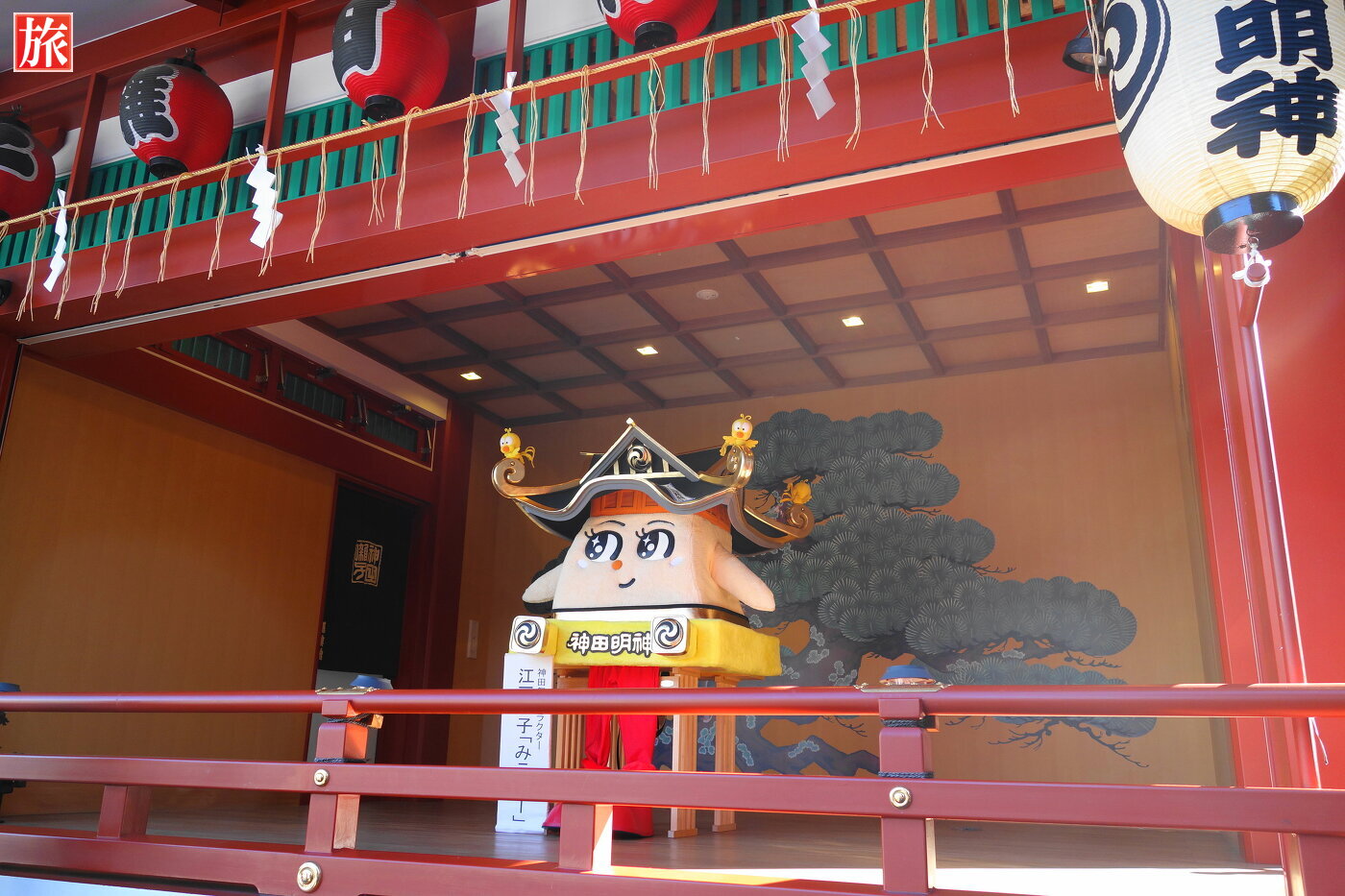 随神門を抜けると、左側に手水舎があります。神楽殿に神田明神のマスコットキャラクター「みこしー」が!祭務所。