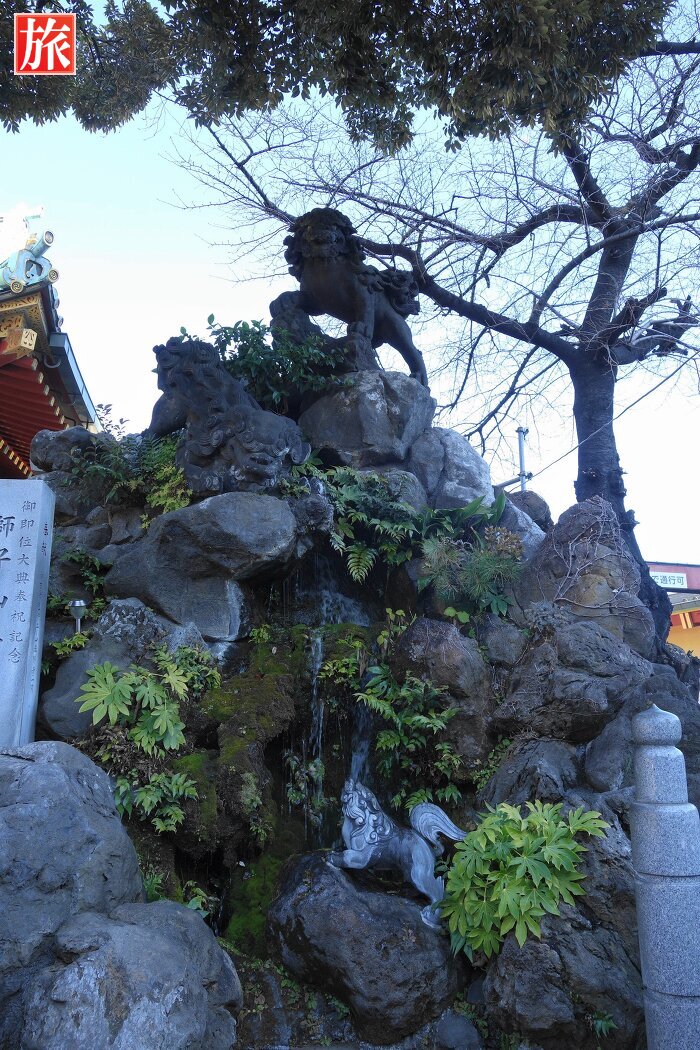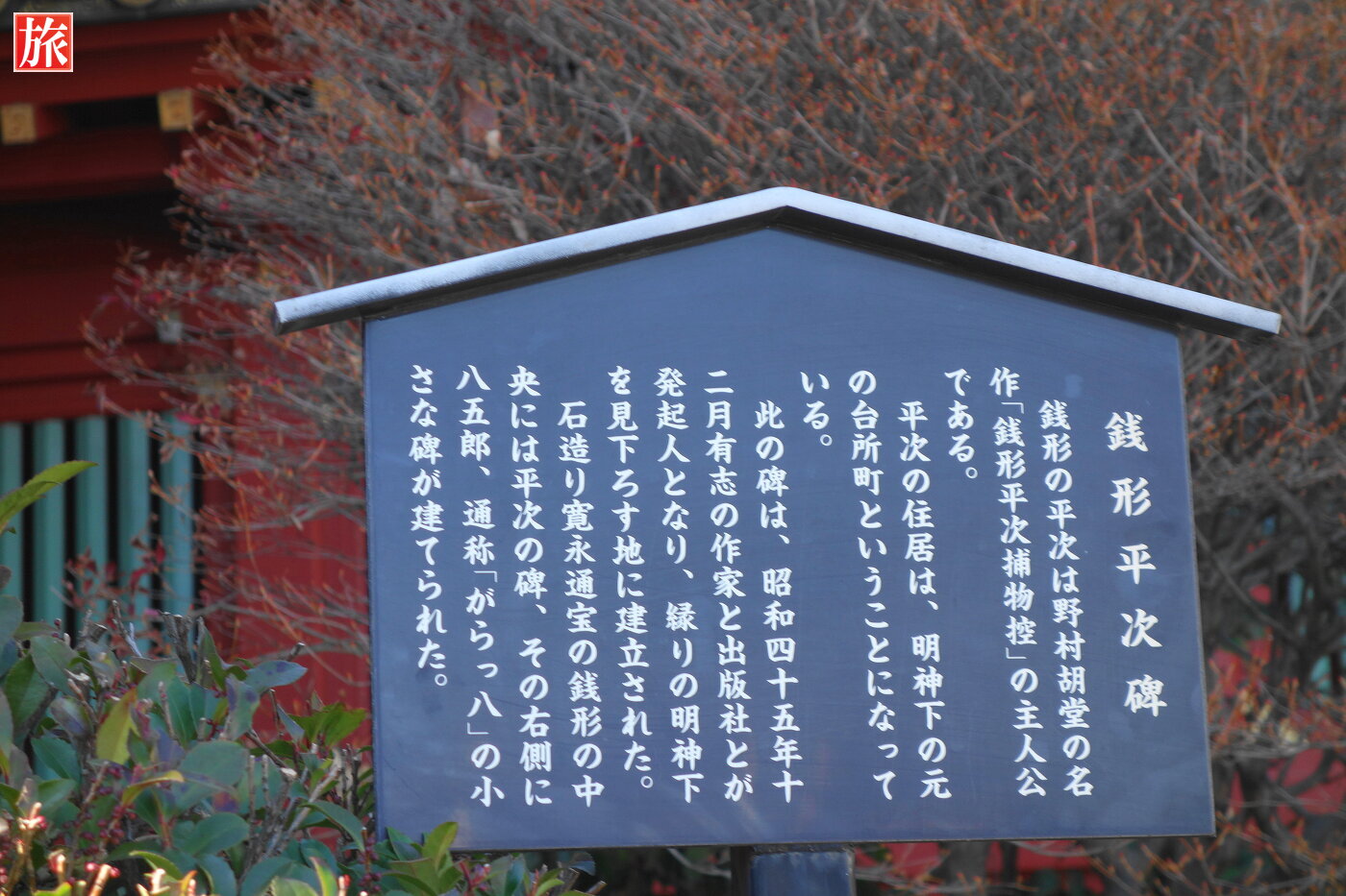 江戸時代に関東三大獅子の一つとして奉献された獅子山。石獅子の説明。銭形平次の碑。銭形平次の碑の説明。