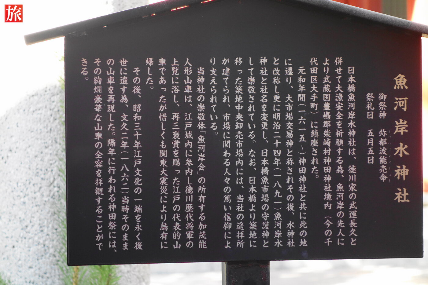魚河岸水神社(水神社)。魚河岸水神社の説明。高さ6.6メートル、重さ約30トンの「だいこく様尊像」。石造りとしては日本一とのことです。お守りをゲット!