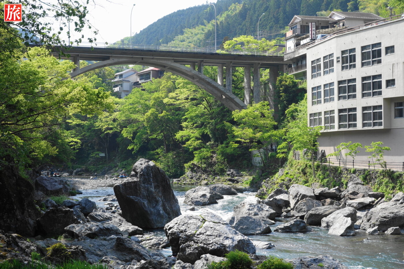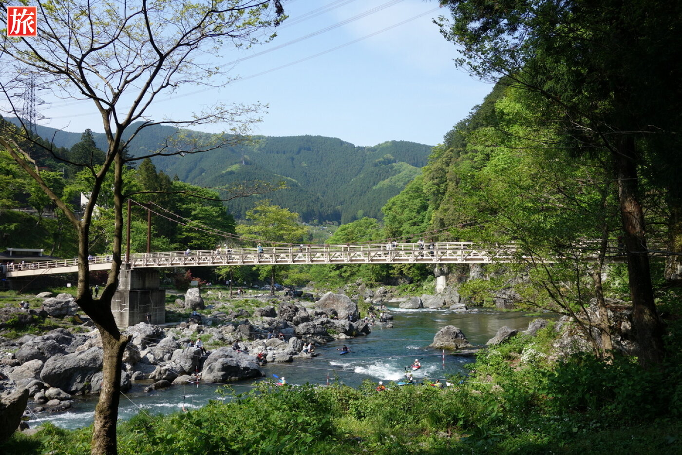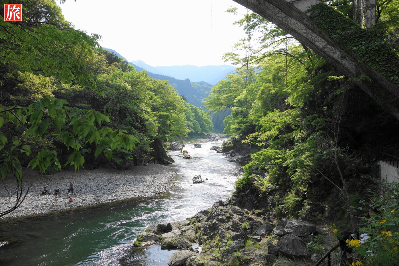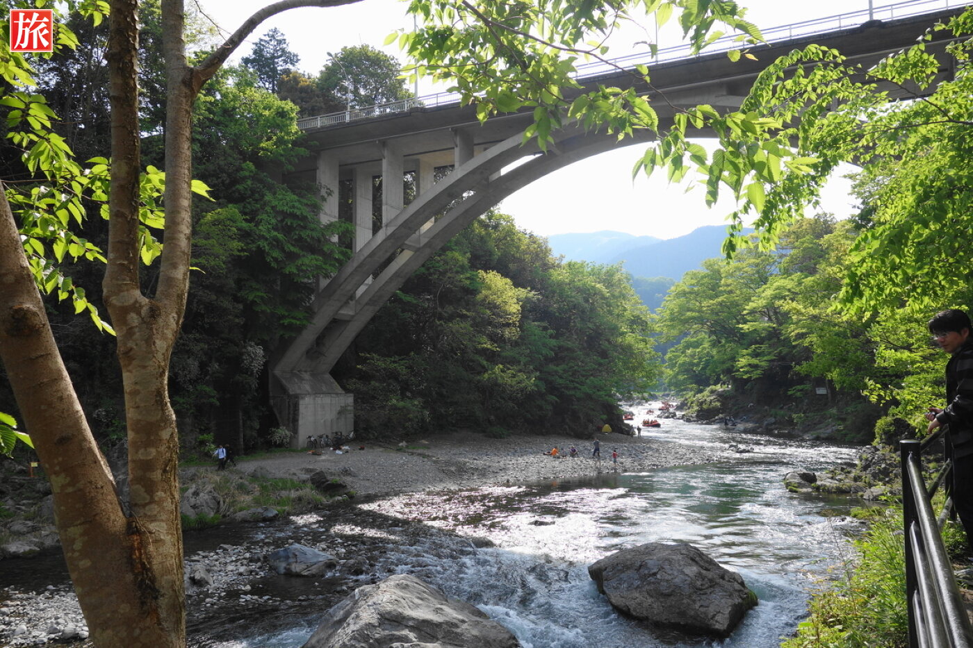 新緑の御岳渓谷御岳渓谷の清流。御岳橋を見上げた風景。御岳橋の上流、次から次へとボートが下ってきます。