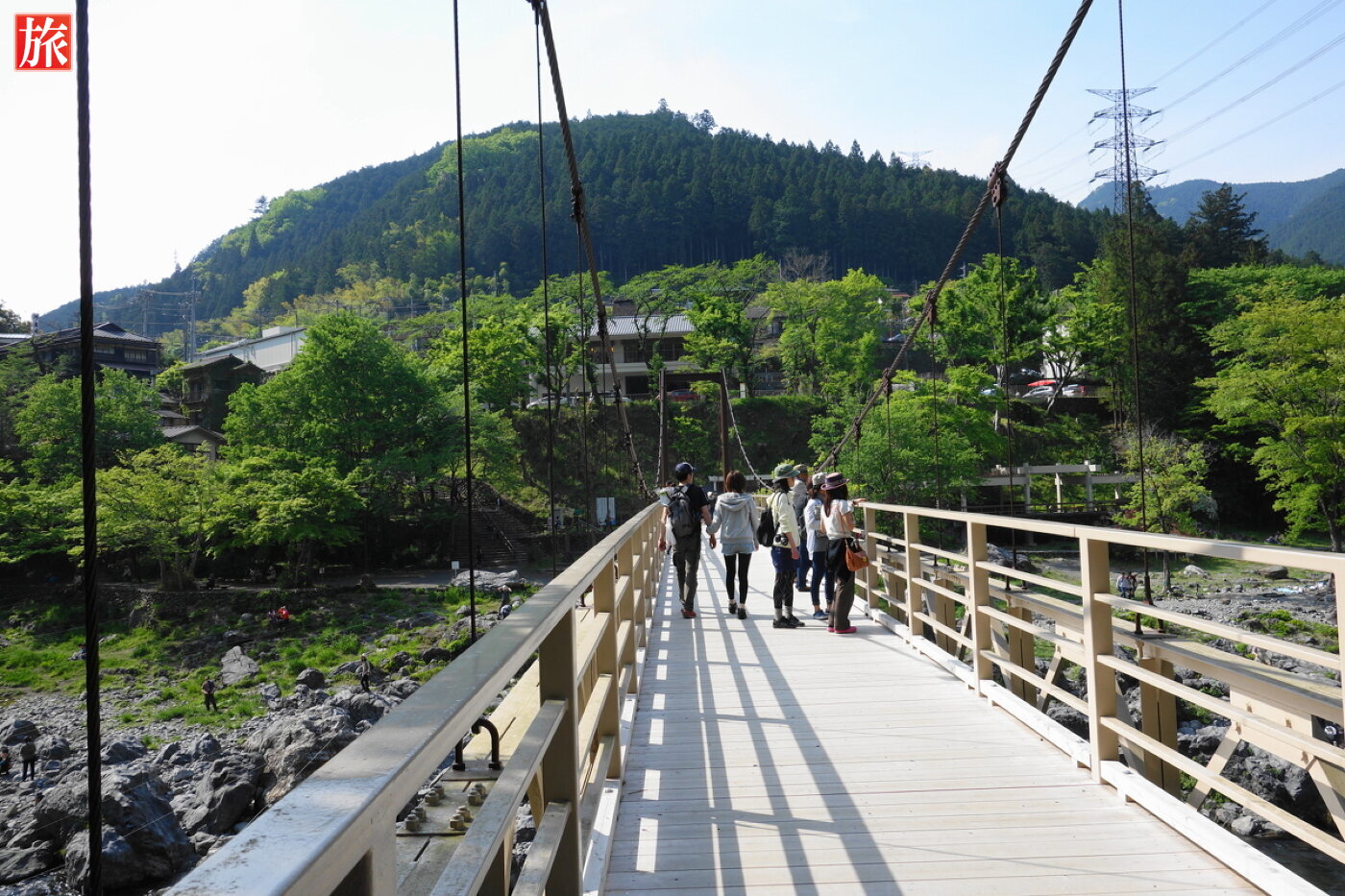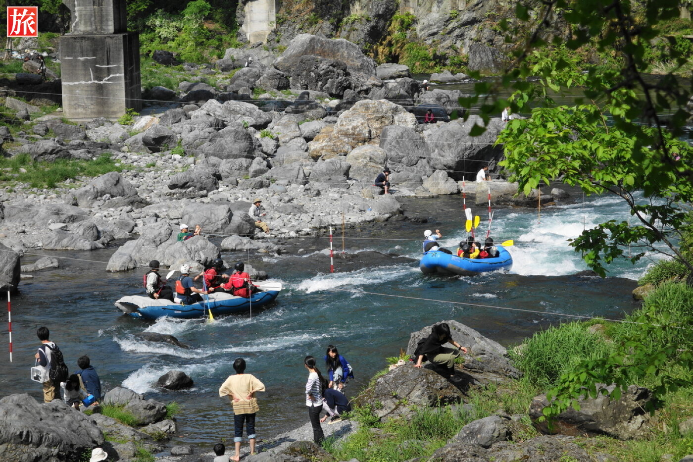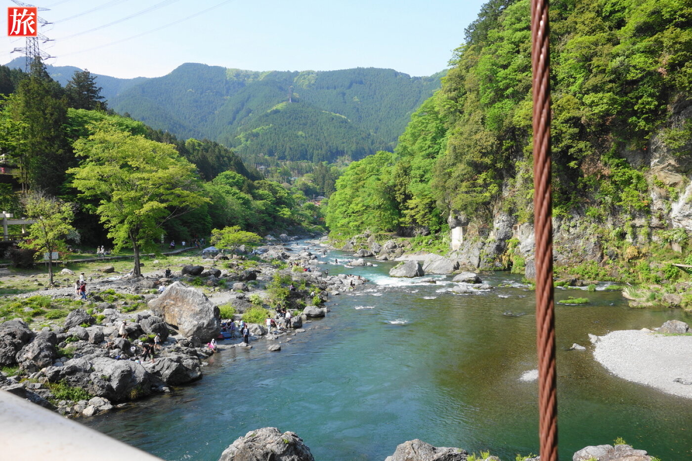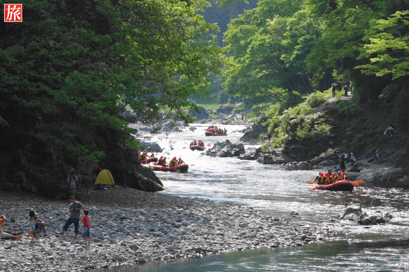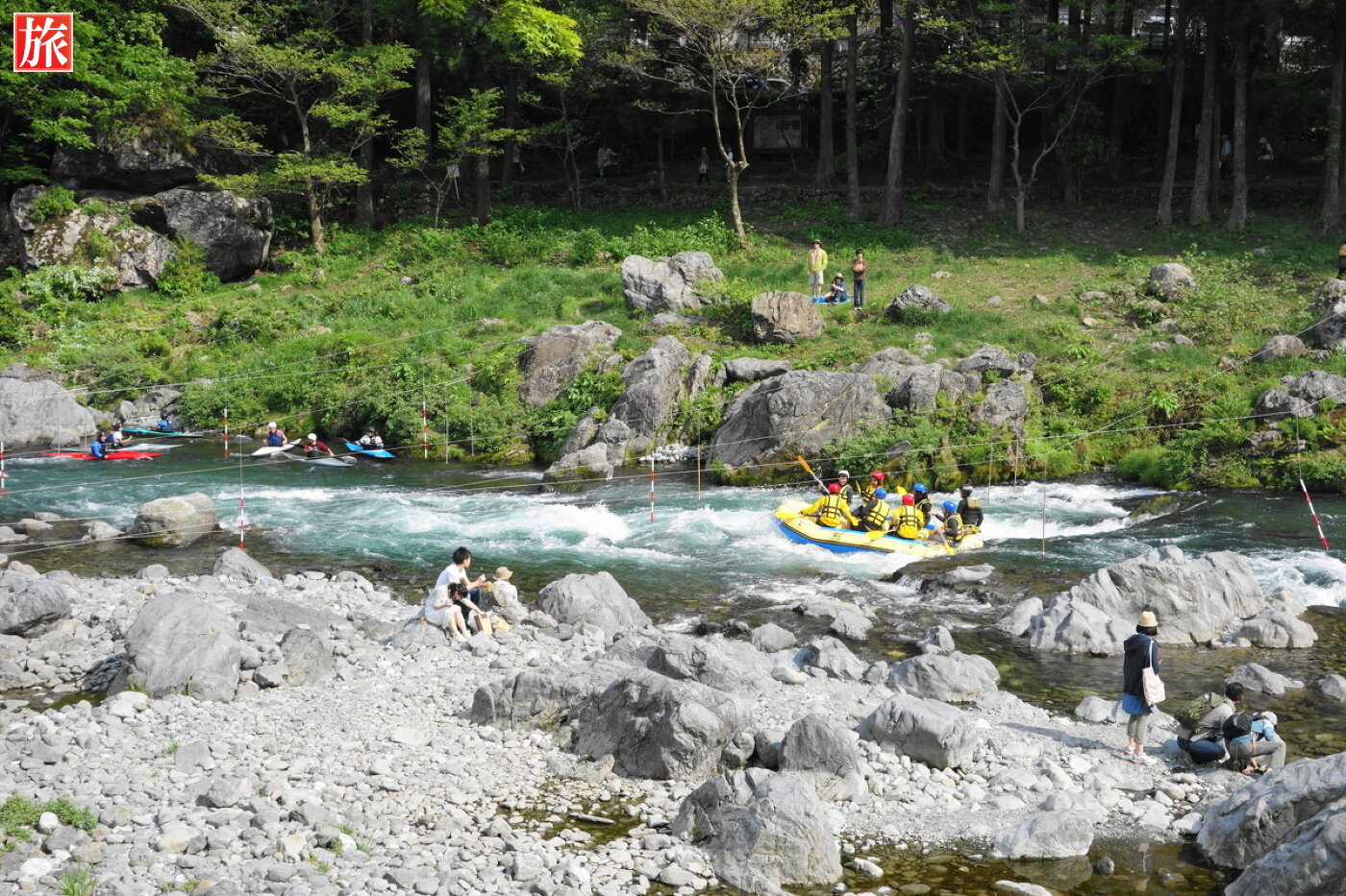 新緑の御岳渓谷御岳渓谷の清流。御岳橋を見上げた風景。御岳橋の上流、次から次へとボートが下ってきます。