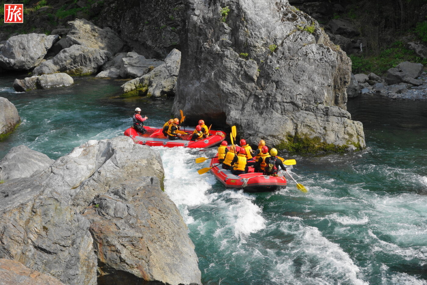 川原で気持ちよさそうに遊ぶ子供たち。ラフトボートで川下りをしていました。カヌーも川を下っています。