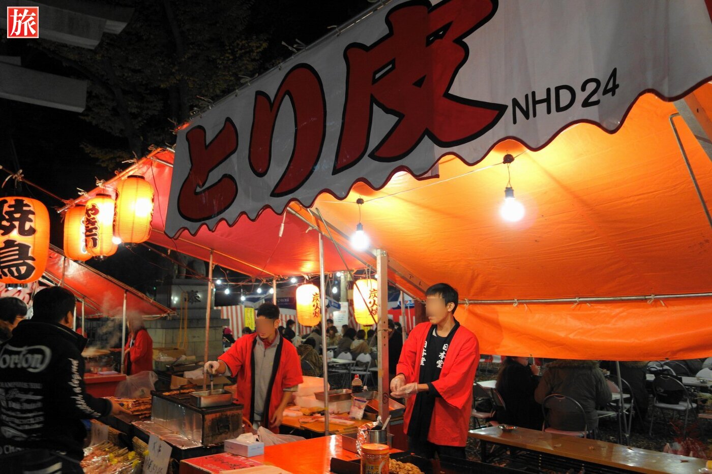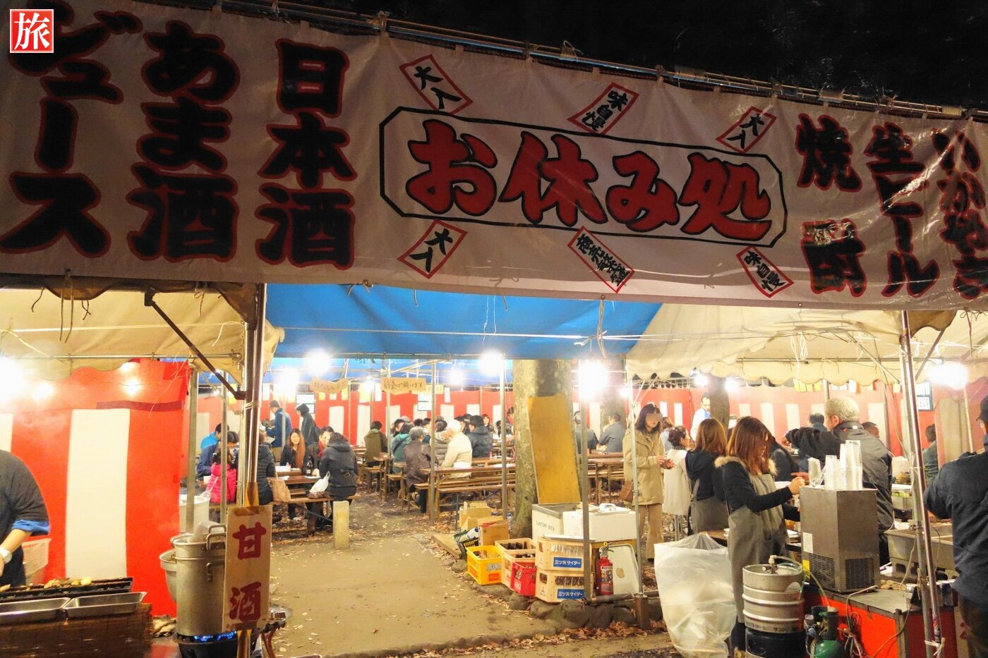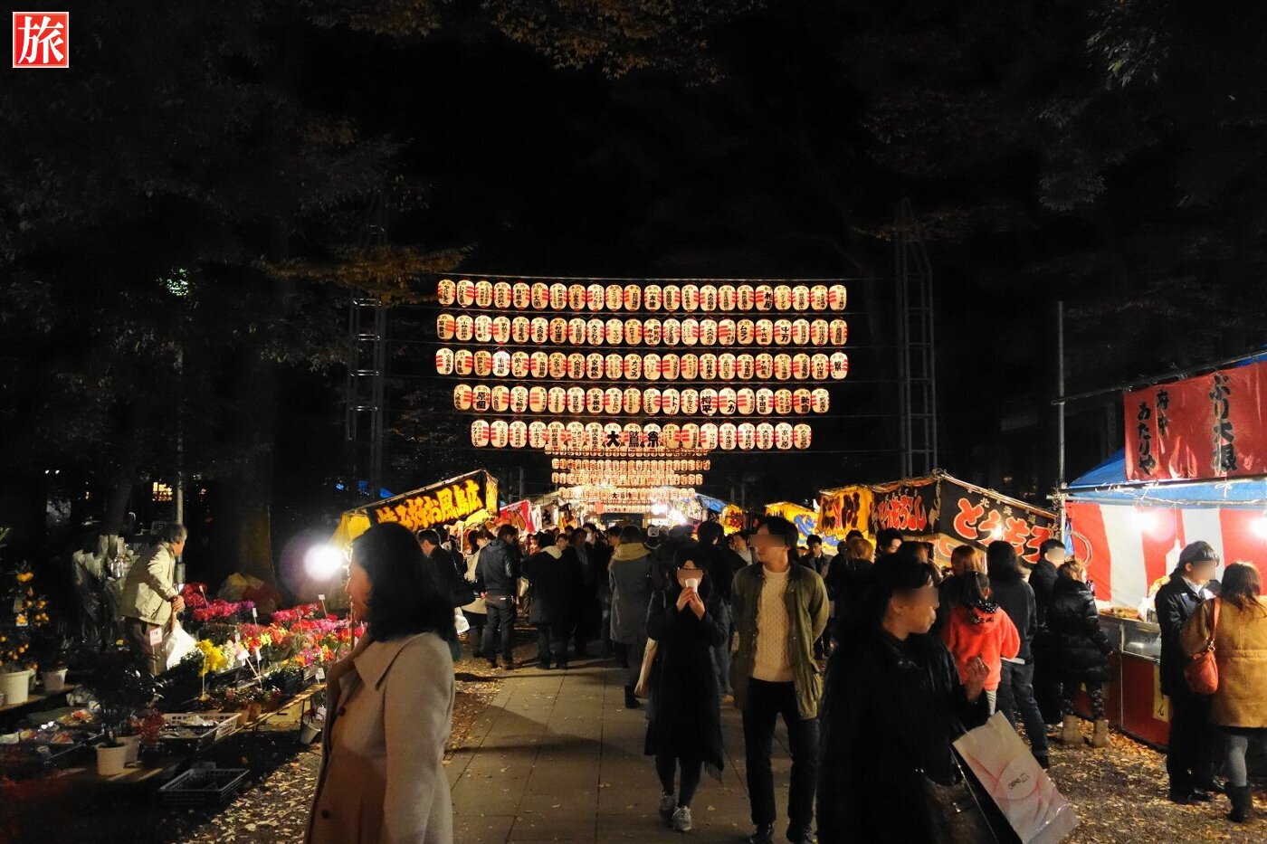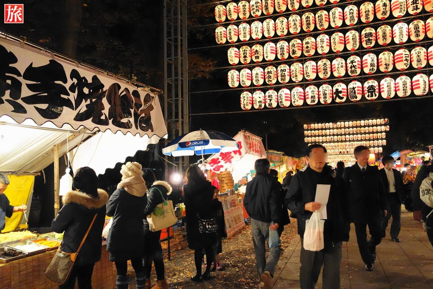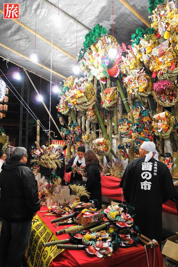 提灯をアップ。テーブル席がある(左手)休憩処。縁起熊手を売る露店。