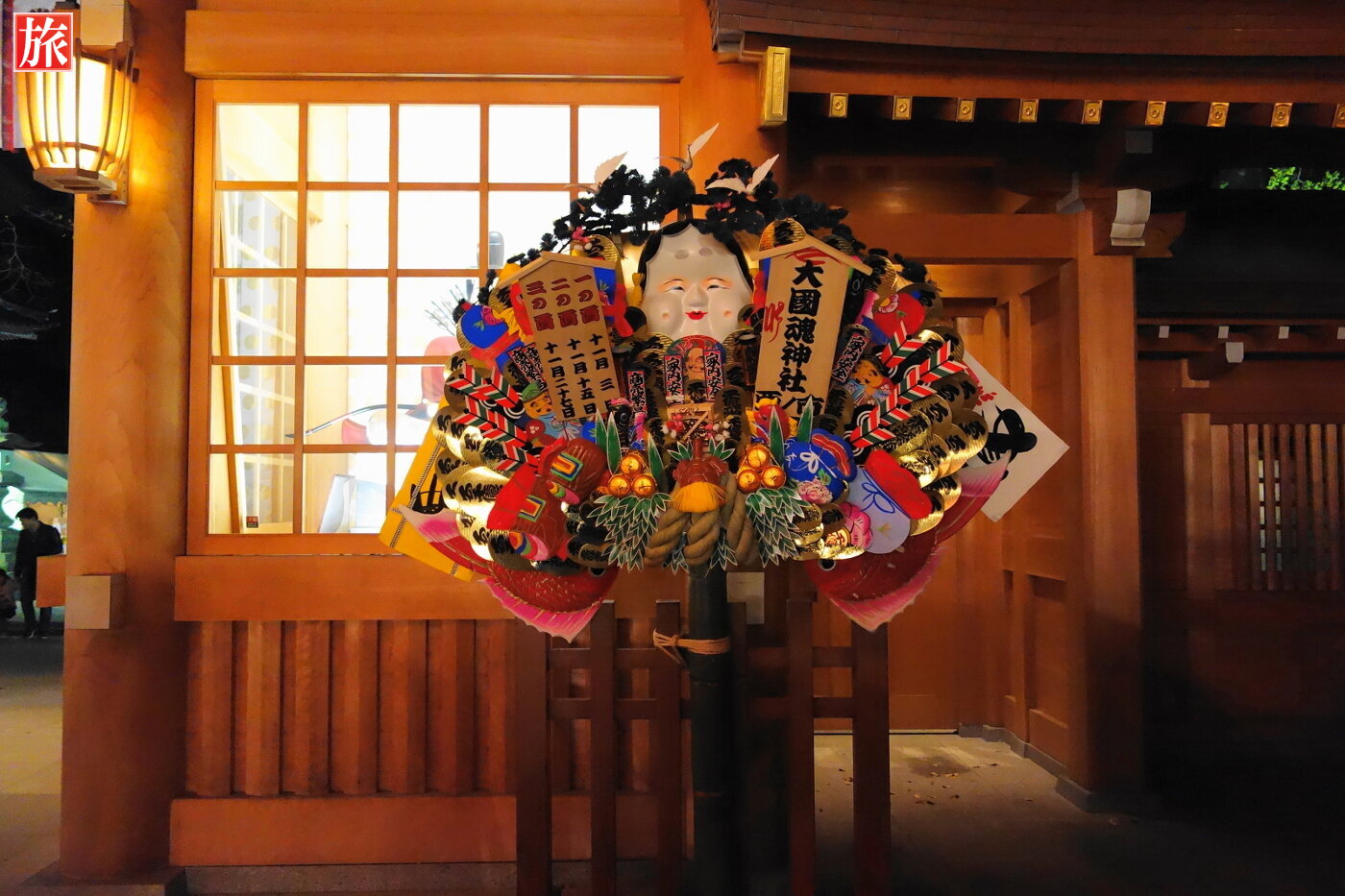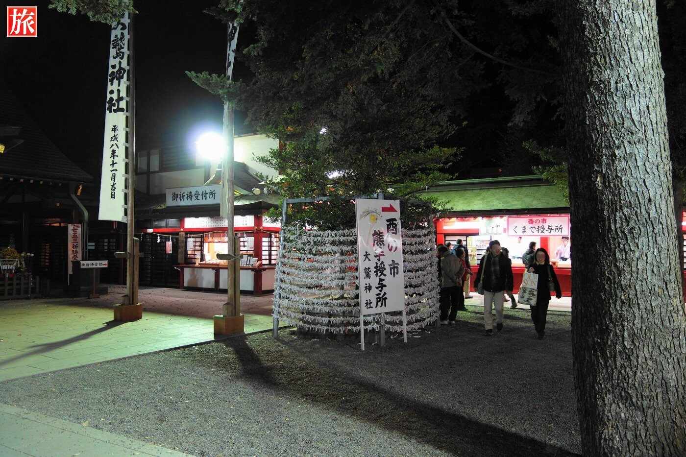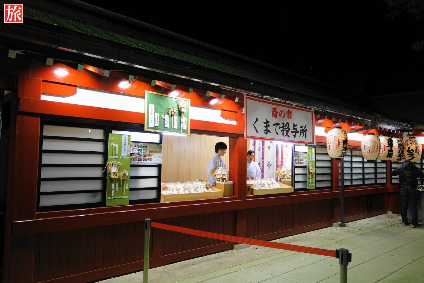 随神門をくぐり先に進みます。本殿・拝殿の右手にある「酉の市」熊手授与所です。お参りする順番を待ちます。