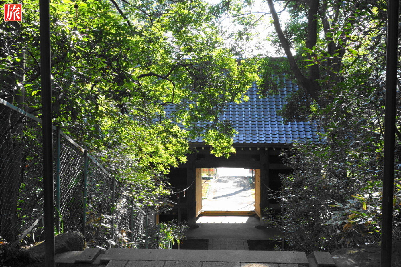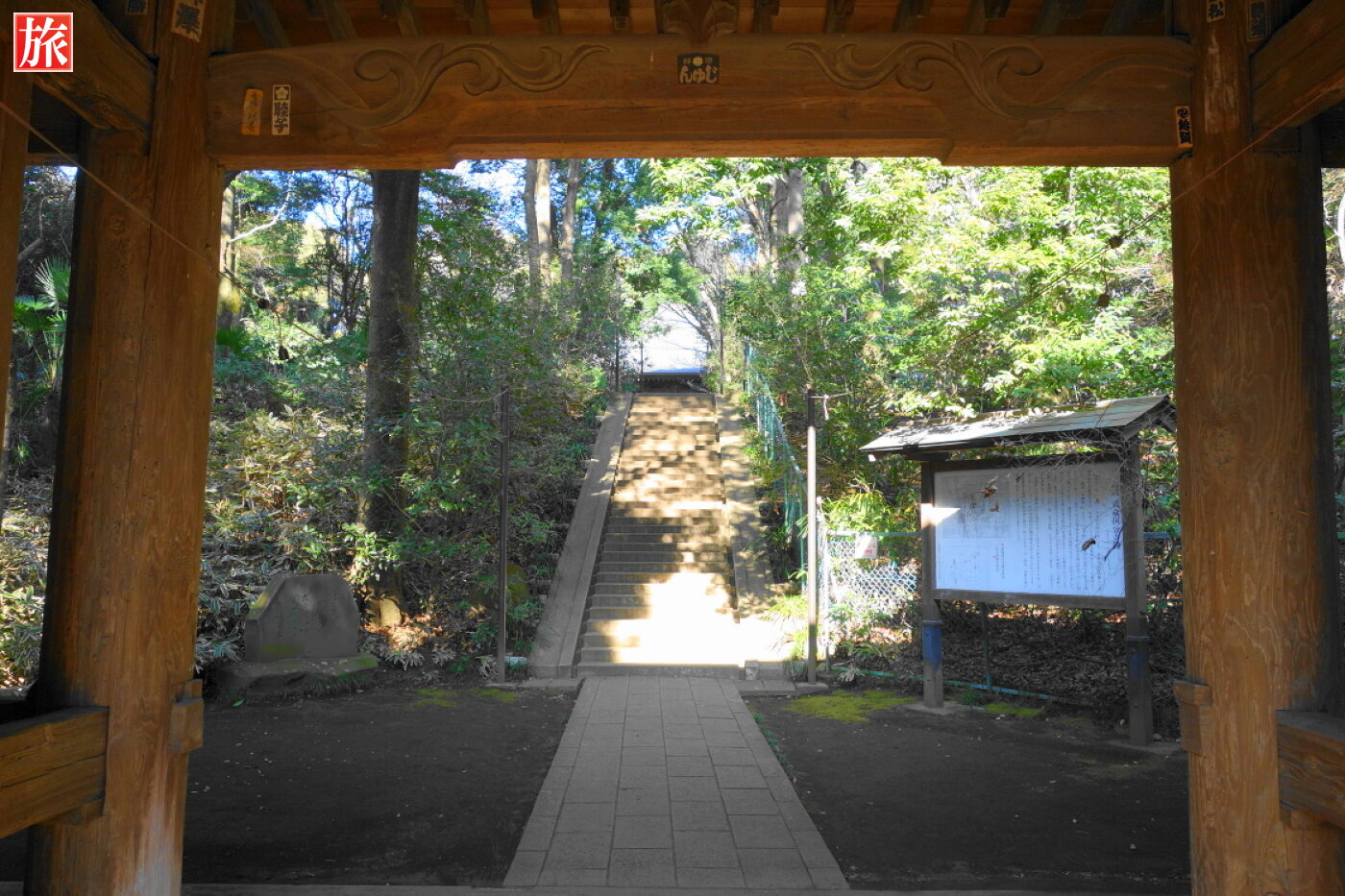 薬師堂入口にある仁王門。仁王門から参道の階段を見る。階段を上っていきます。上から仁王門を見た様子。