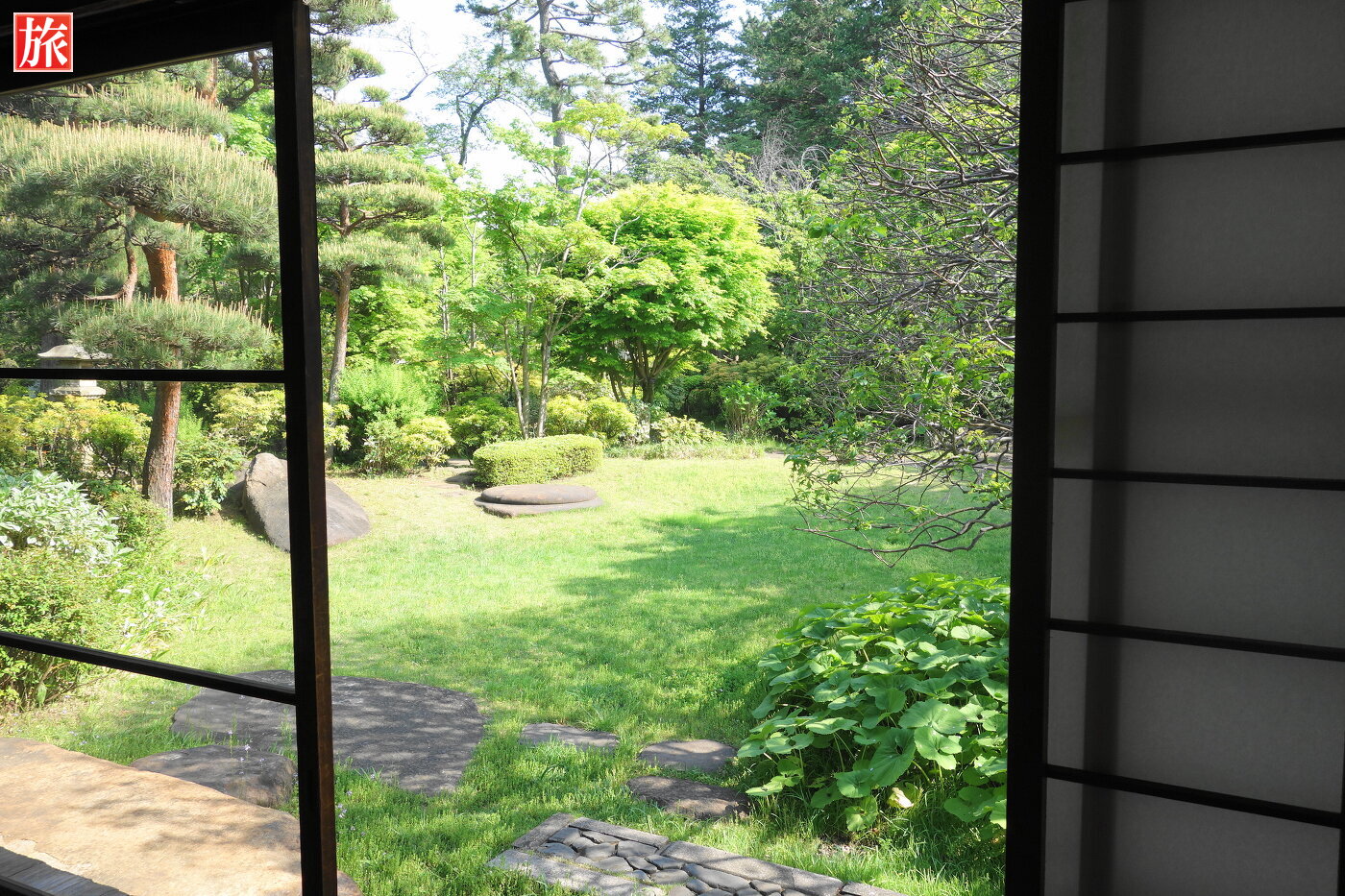 三井八郎右衛門邸。倉内は写真撮影禁止でした。部屋の様子(1階)。庭の風景。近代的なキッチンは1879(明治30)年ごろ京都に建てられ戦後港区に移築されたもの。