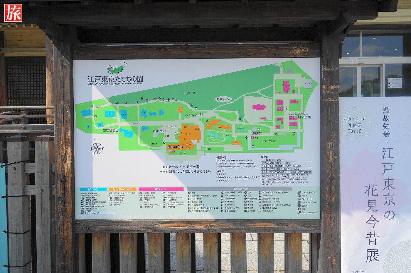 江戸東京たてもの園全体図。入場料は一般大人一人400円。入場券とパンフレット。ビジターセンター内ミュージアムショップ&カフェ。