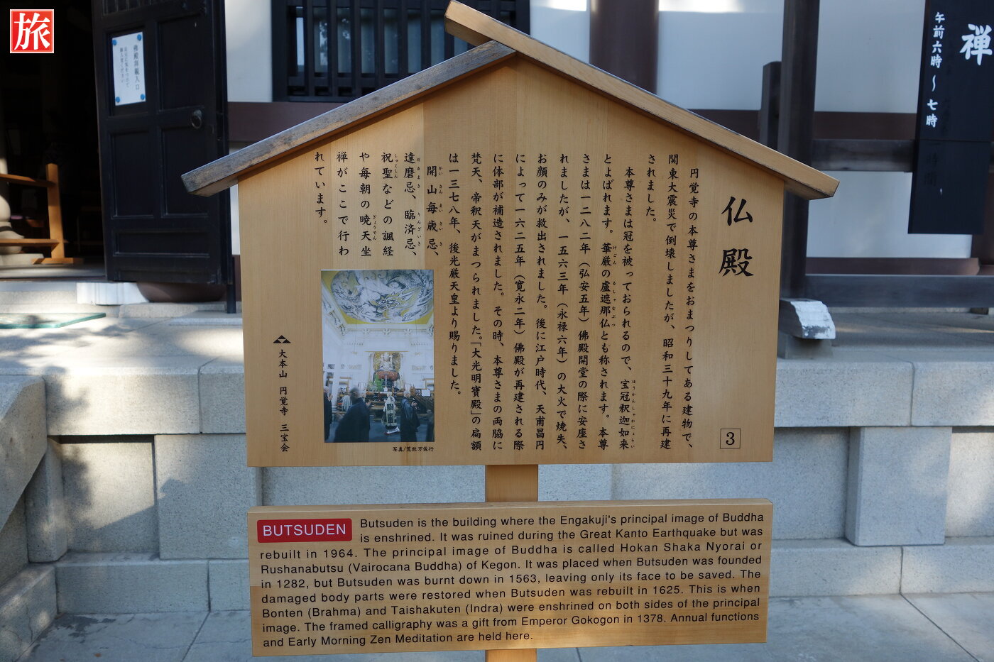 山門をくぐると仏殿が見えてきました。この中に本尊さまが安座されています。仏殿の説明板。大正12年(1923)の関東大震災で倒壊、のち昭和39年(1964)に再建されたそうです。