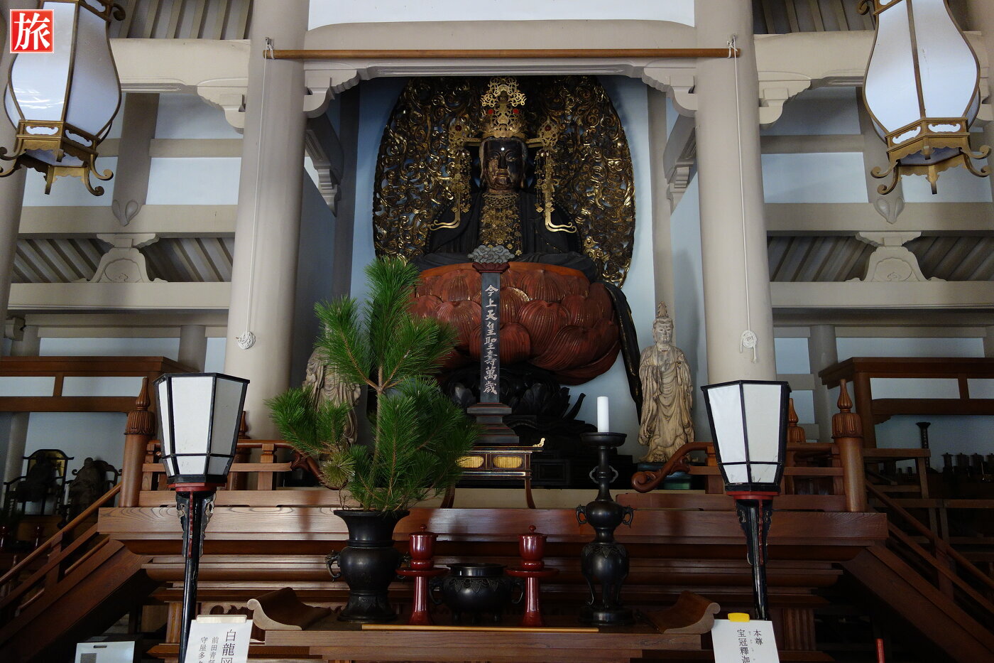 仏殿内の様子。天井には白龍の図(前田青邨監修、守屋多々志揮毫)が描かれています。宝冠釈迦如来坐像。丈六の釈迦如来像は、廬舎那仏ともいわれ、頭の部分だけが鎌倉時代に作られたものとのことです。脇侍は梵天と帝釈天といわれています。