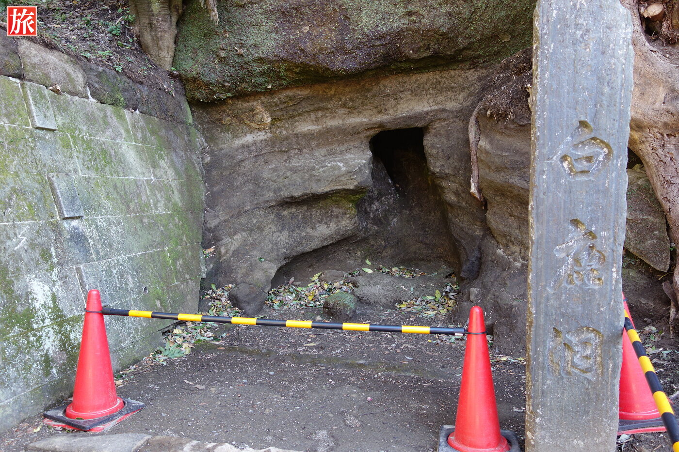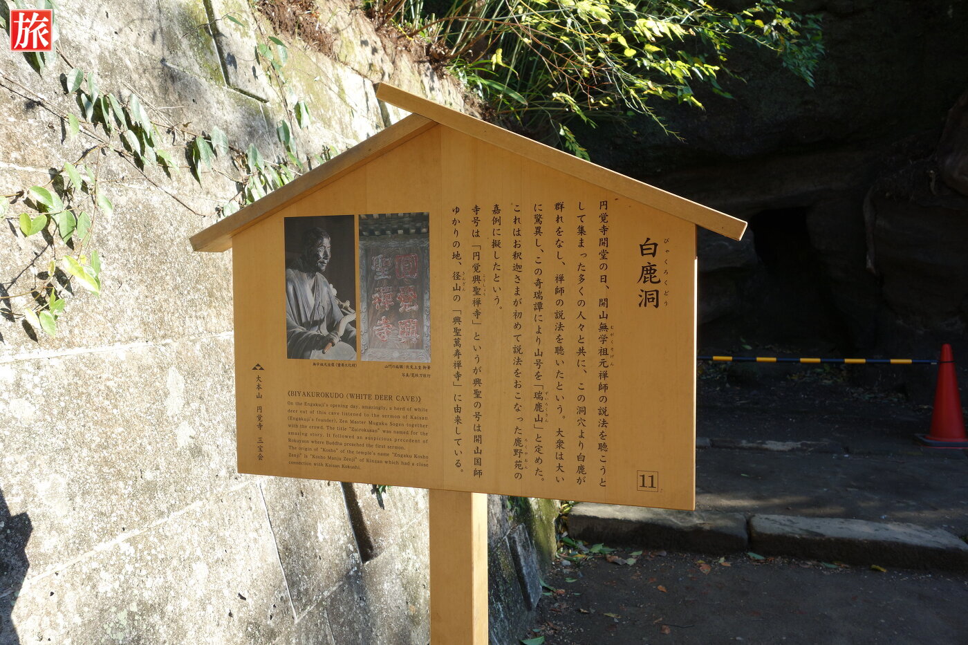北条時宗の廟所「仏日庵」。この白鹿洞から白鹿が群れをなして出てきて、無学祖元の法話を聞いたと伝わる。白鹿洞の説明。