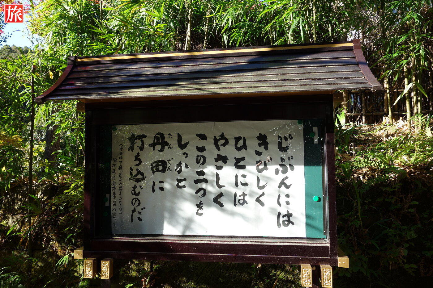 黄梅院の掲示板「じぶんにはきびしく ひとにはやさしく この二つを丹田に打ち込むのだ」揮毫されたものを月初めに貼り替えているようです。
