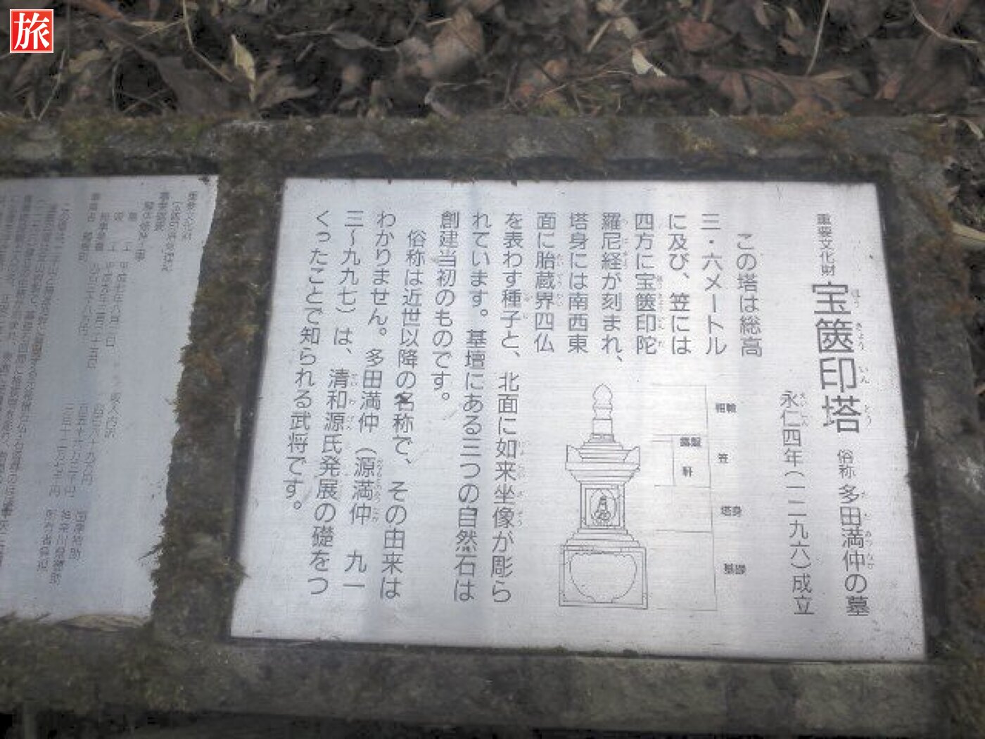 さらに130mほど進むと多田満仲の墓塔と伝承される石造宝篋印塔が向かって左側にあります。石造宝篋印塔の説明。