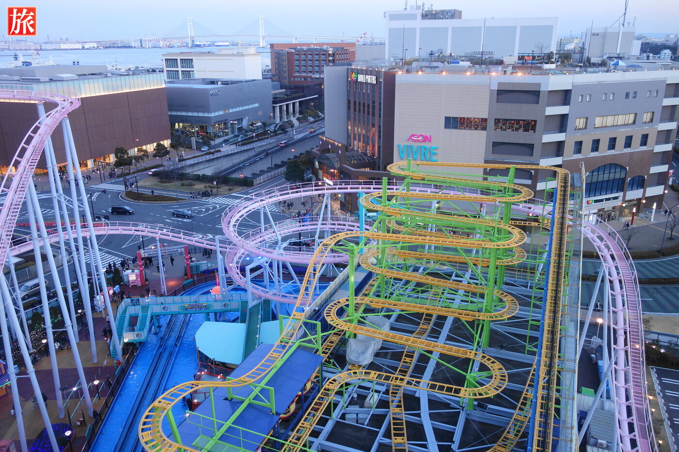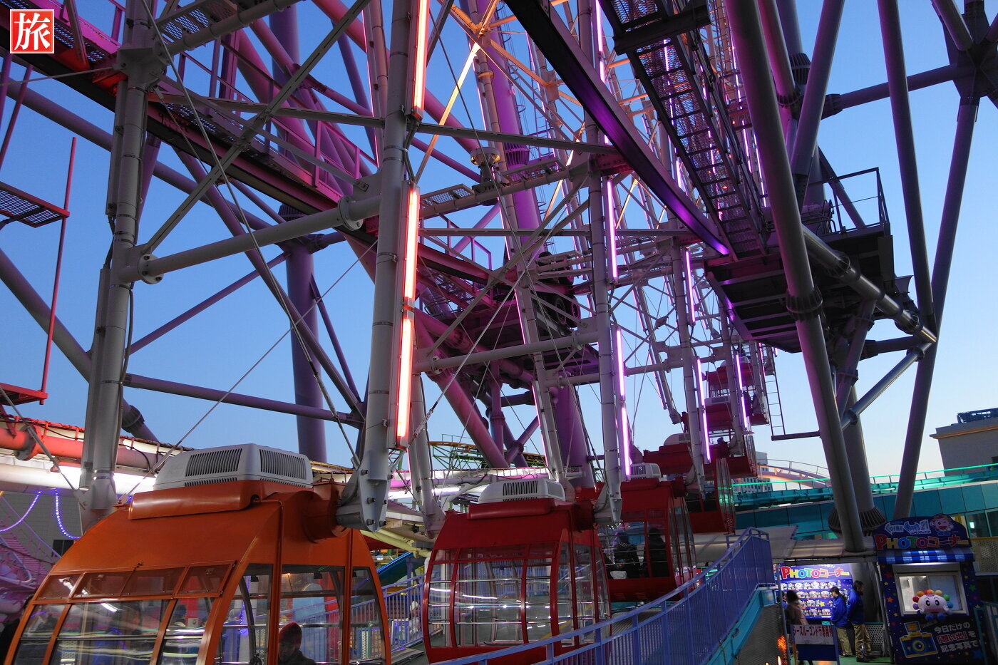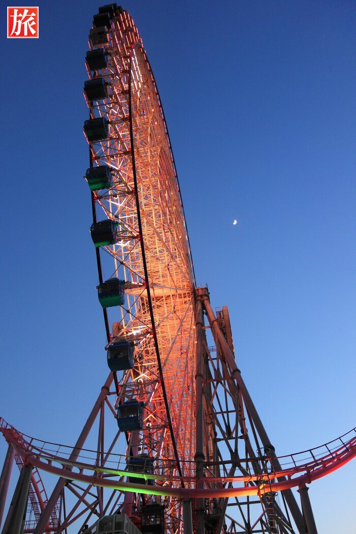 夕暮れ時、幻想的な時間が過ぎて・・・・日帰り温泉施設の万葉倶楽部が側にあります。世界初の水中突入型ジェットコースター。