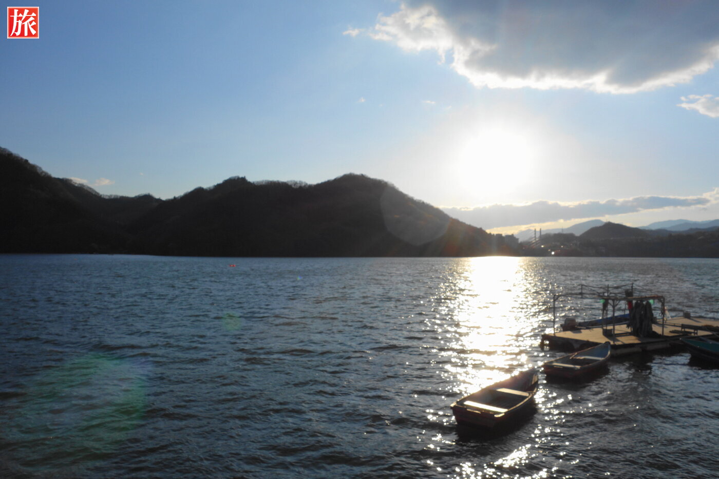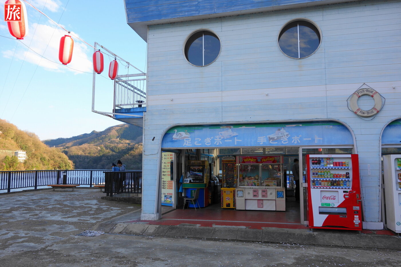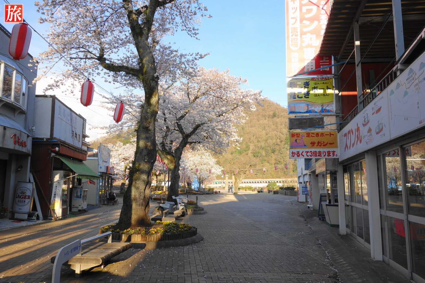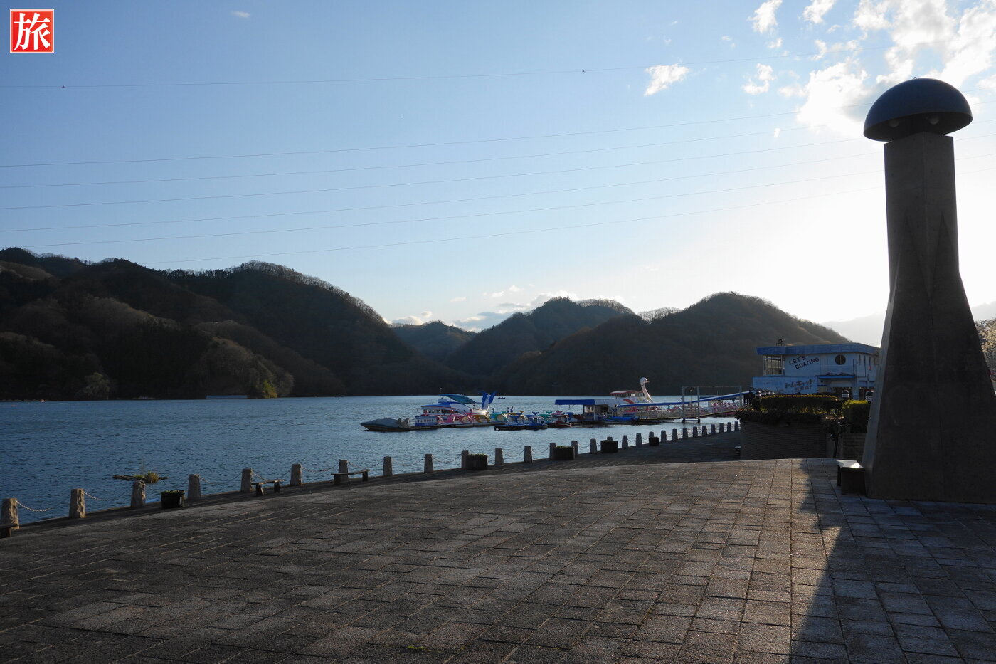 メイン通り(商店街)の雰囲気。ボート乗り場の様子です。日が暮れかかった相模湖。