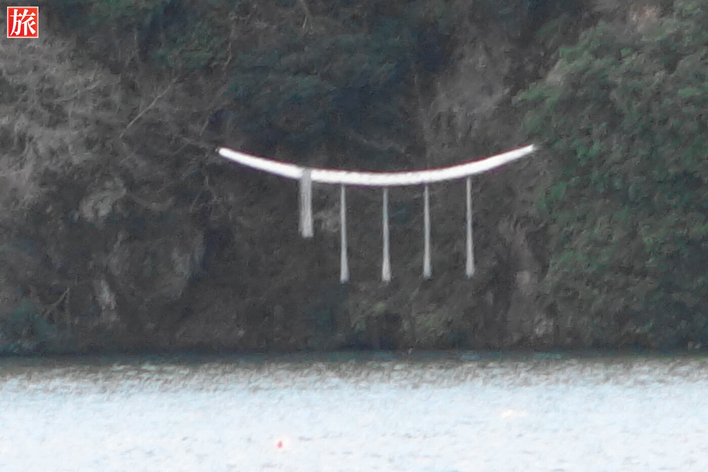 湖の対岸にはしめ縄。長さ約30mのしめ縄をズーム。手漕ぎ、足漕ぎボートの受付。