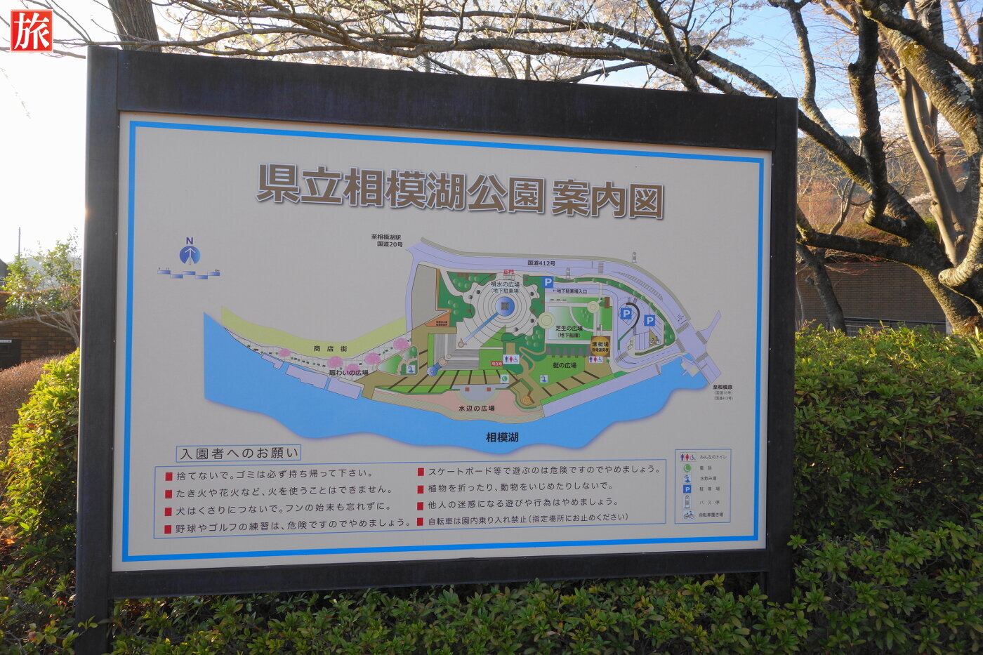 噴水広場地下にある県立相模湖公園の駐車場に車を止めました。平日のせいか無料でした。県立相模湖公園の案内板。水辺の広場付近の様子です。