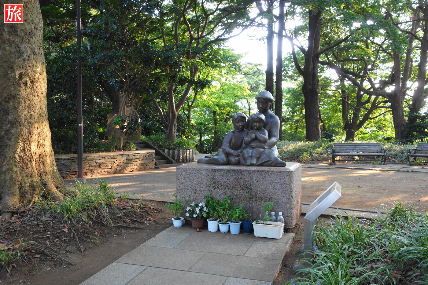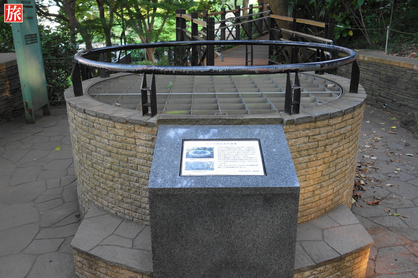 森林広場付近には、航空事故の犠牲者をモデルとした「愛の母子像」。レンガ作りの井戸遺構。階段を上り橋を渡ると展望台が見えてきます。