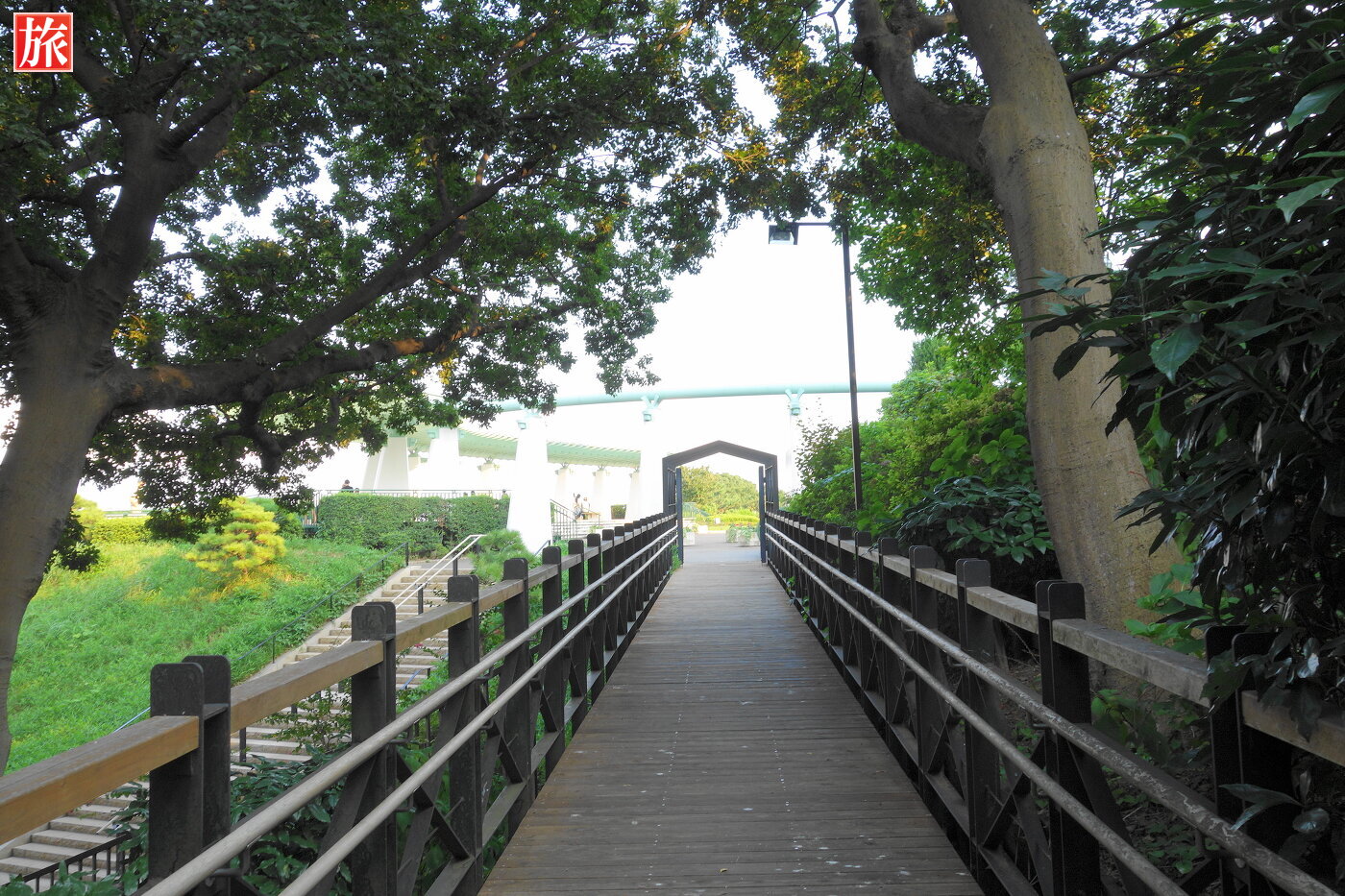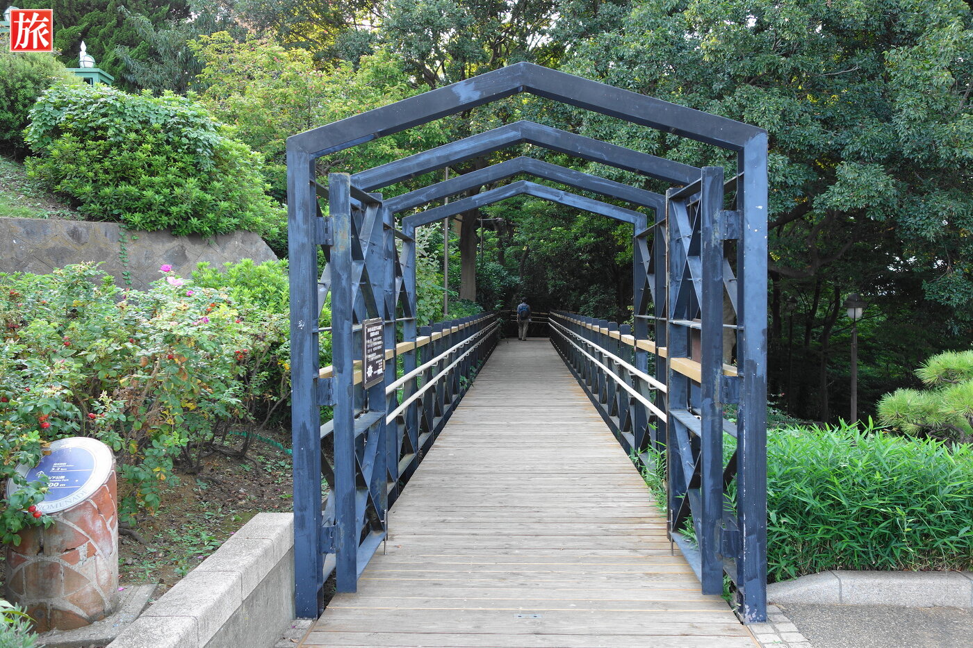 港の見える丘公園入口にかかるフランス橋。公園の入口の様子。横浜人形の家とフランス山を結ぶ「フランス橋」。橋の上の様子。
