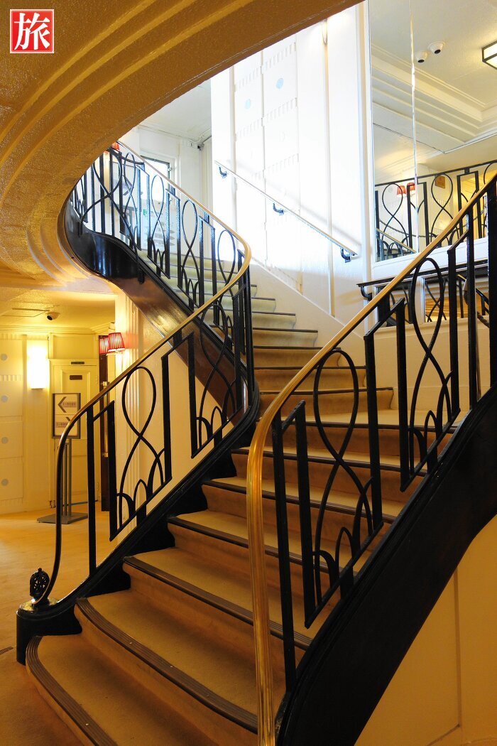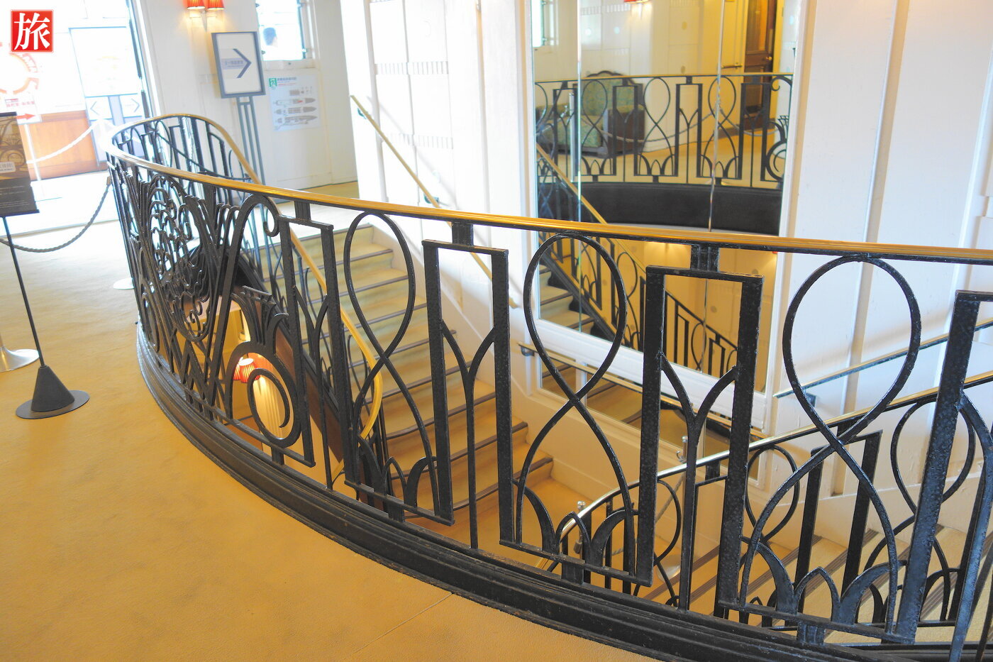 二股に分かれる階段。一等船客が手紙や読書のために使用した一等読書室。一等社交室。