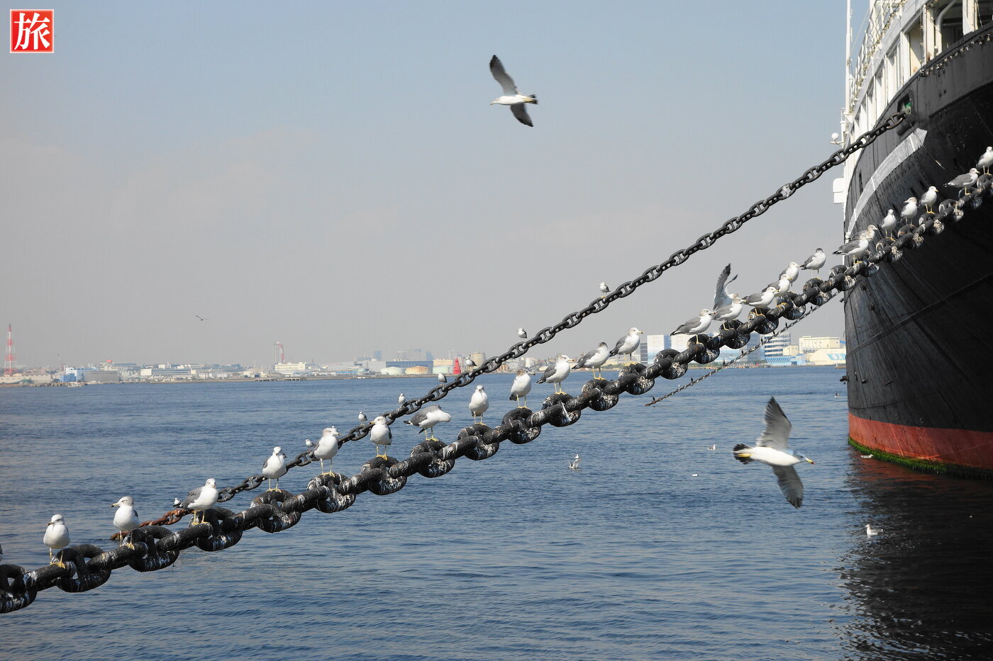 日本郵船氷川丸の外観。錨鎖でカモメが羽を休めています。氷川丸入場券売場。