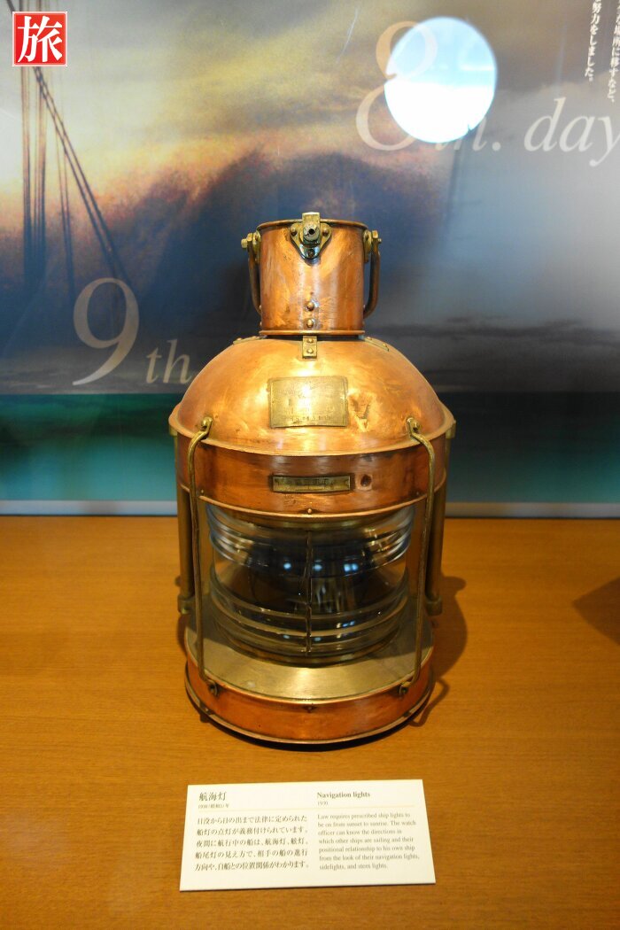 8人部屋の三等客室。氷川丸は11年間で太平洋を146回横断し、約1万人が乗船した客船です。白灯台の説明。
