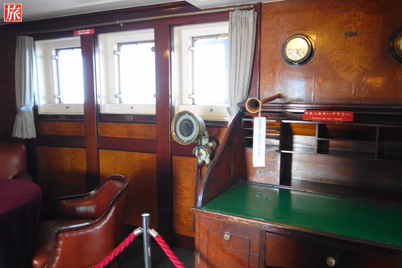 山下ふ埠頭の内防波堤から移設されてきた白灯台。黒地に白ライン三本、赤ライン二本が描かれた大きな煙突。船長室。