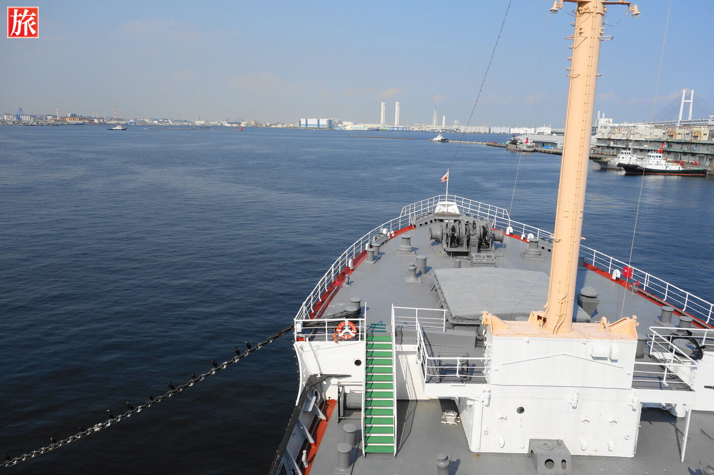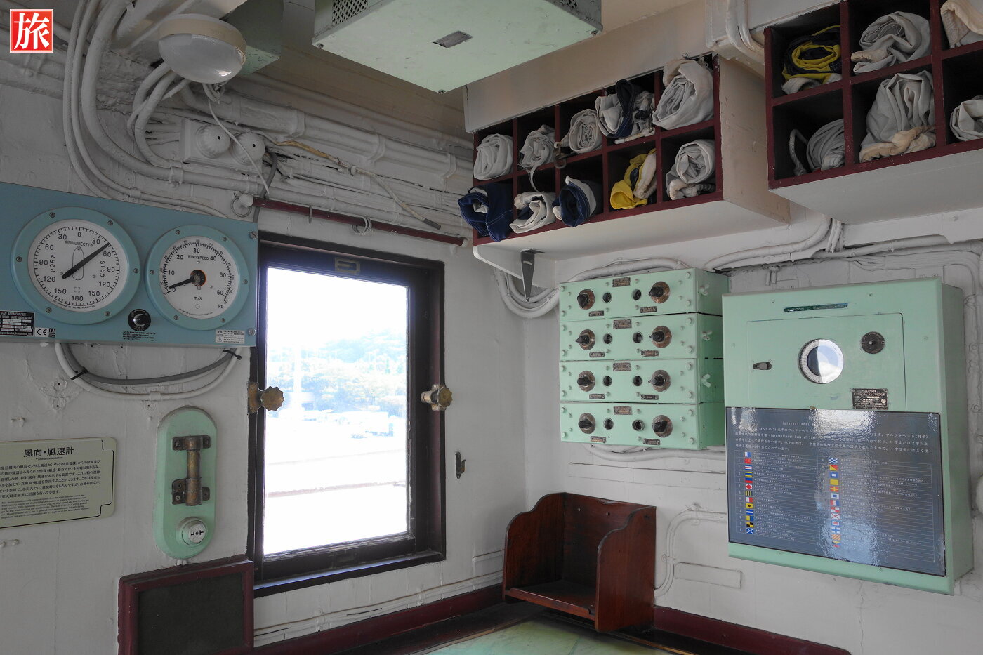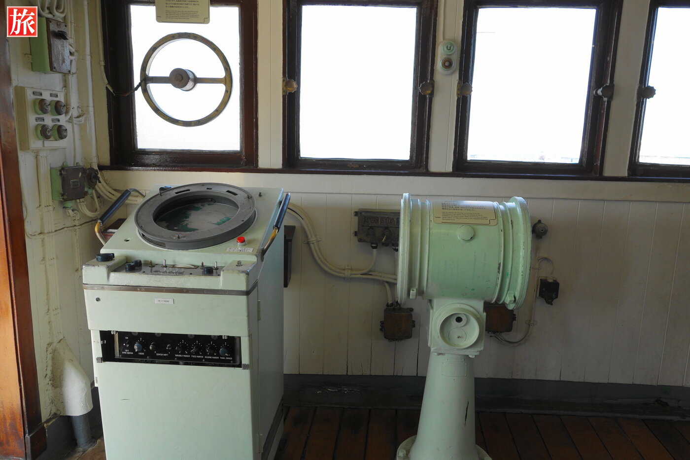 「クリアビュースクリーン」天候が悪く強い風雨や波の中では、ワイパーのようなものでは役に立たないので、円盤状のガラスが高速回転して、その遠心力で水滴を飛ばして、良好な視界を確保する装置です。船上オープンデッキ。オープンデッキからマリーンタワーを望む。
