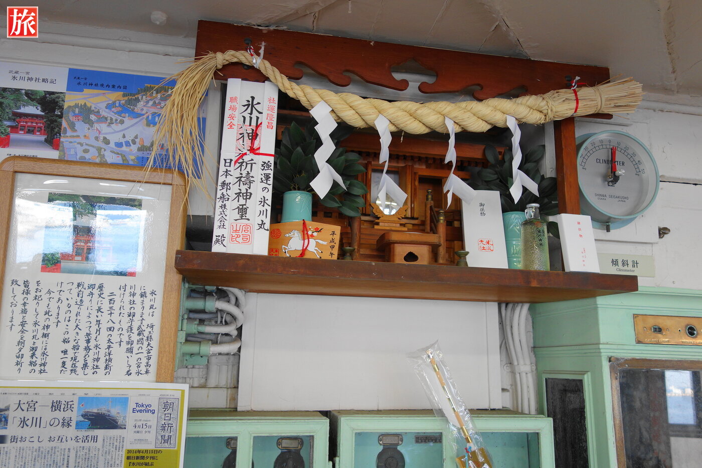 竣工当時の送受信機。モールス信号発信機。神棚には氷川神社の御札が祀られています。風向・風速計。