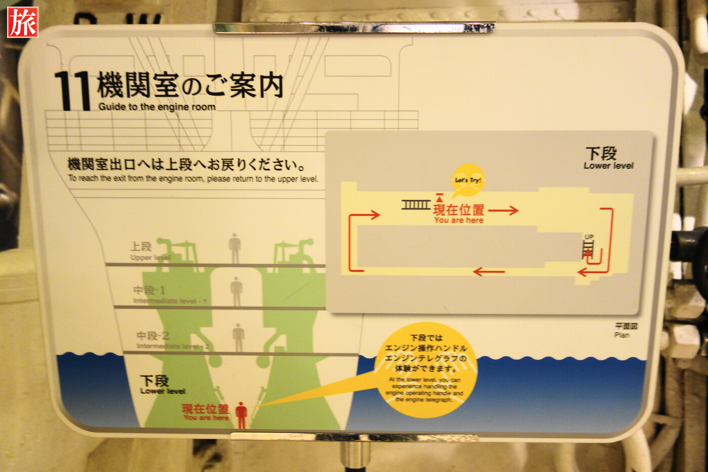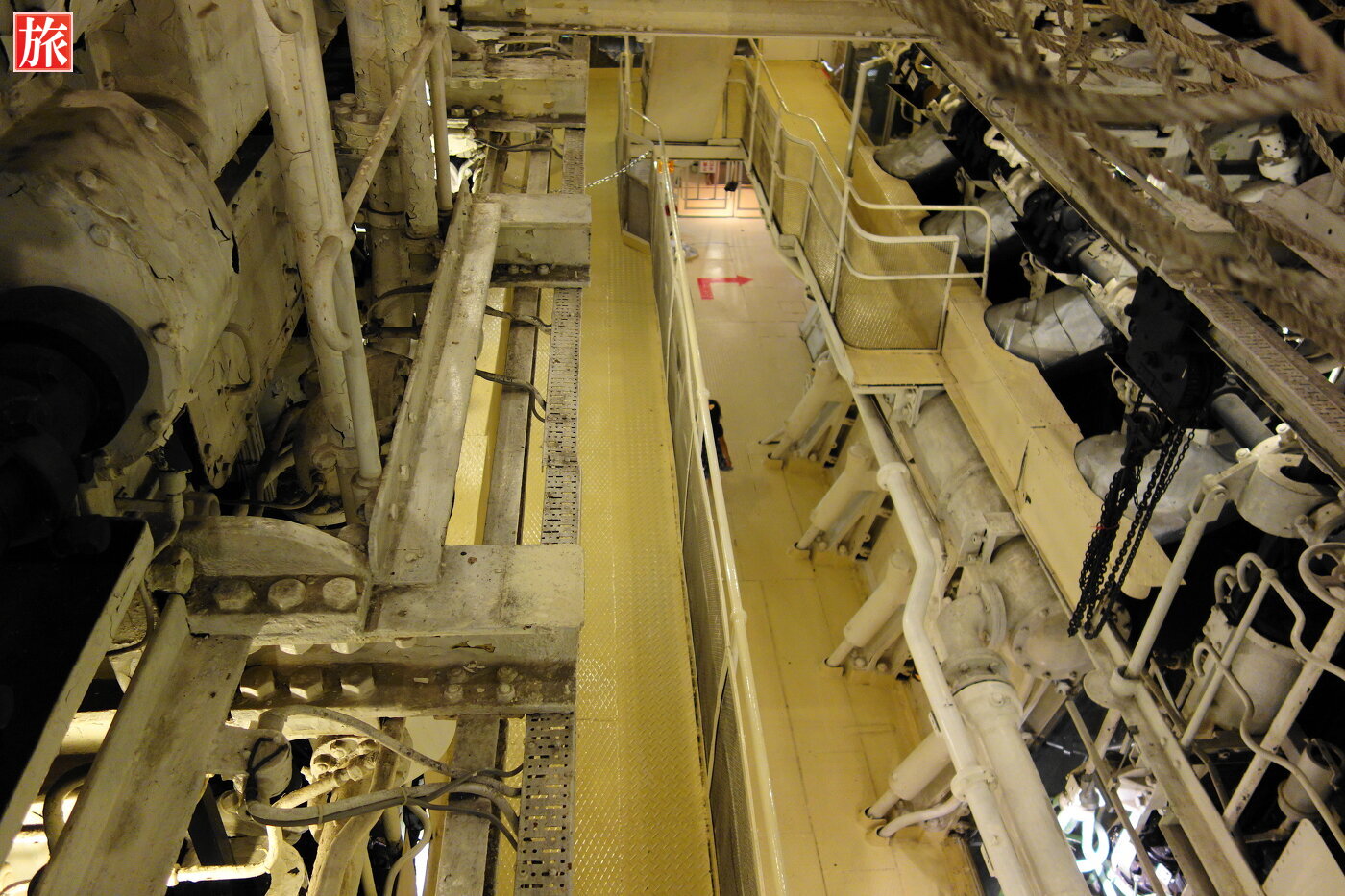 機関室中段-1。機関室中段-1から下段を見た様子。